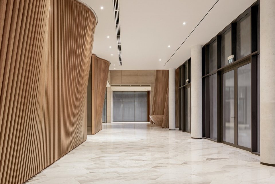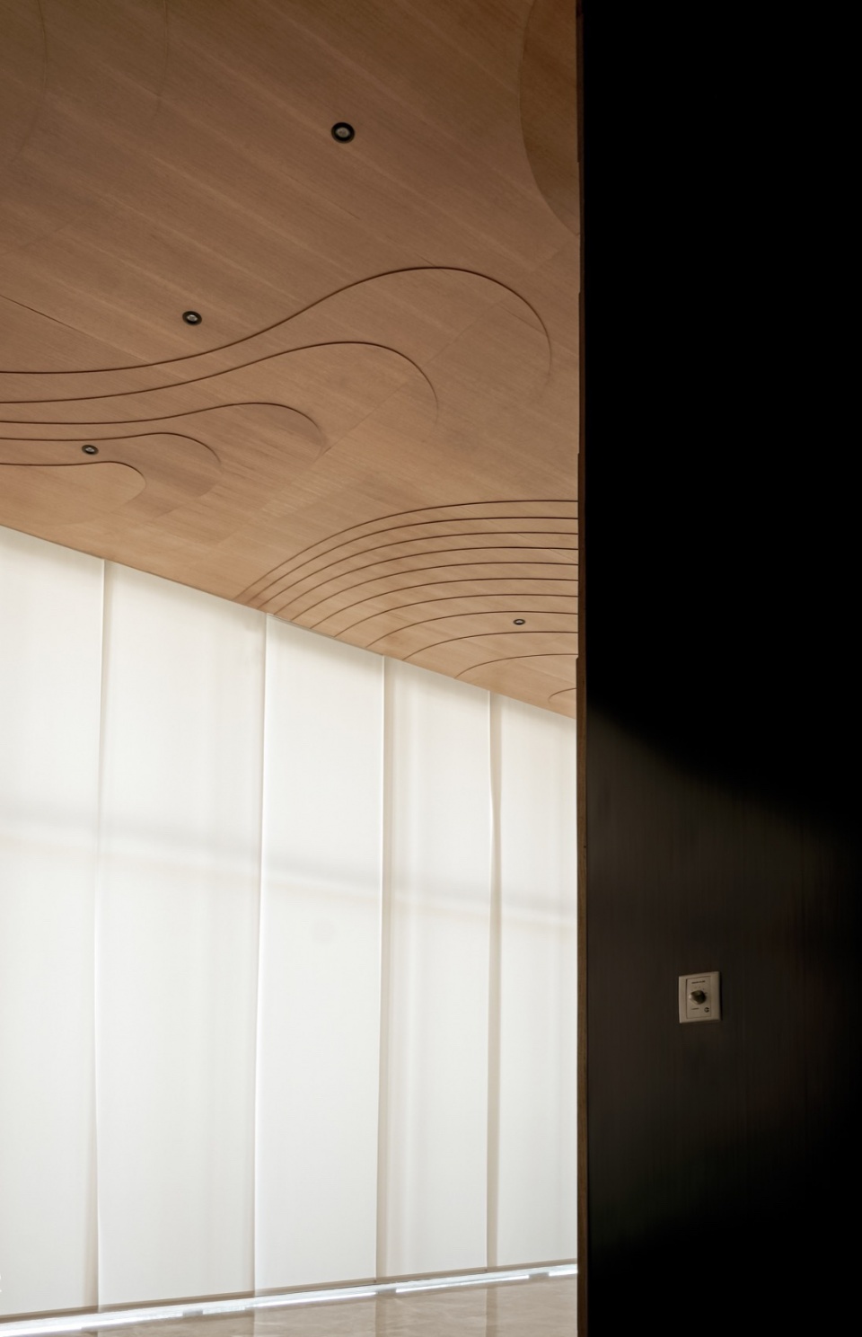 接待厅的吊顶设计尤为引人注目,以一系列同心波浪状的图案构成富有雕塑感的视觉焦点。这些面板由聚合材料雕刻而成,组合后形成具声学性能的三维表面。其律动感为天花板注入流动的张力,而模块的重复又保持了整体语言的统一。嵌入于凹槽中的照明系统强化了细节,营造柔和氛围,丰富了空间体验。