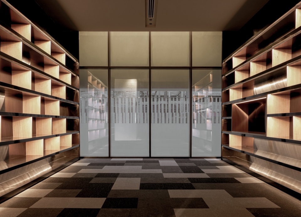 进入大使馆后,首先体验到的是门厅(Foyer)空间,一个带有高天窗的中庭。门厅是通往接待厅、图书馆、办公区等多个功能区域的门户,也是大使馆中最开放的公共空间,具备灵活性,亦可作为接待厅的前区使用。接待厅是整个大使馆的核心与特色空间,为馆方在文莱举办公共与文化活动提供了平台。流动性的室内布局使设计引入了隐性的引导性与空间导视。例如,从入口望向门厅,一排垂直木质格栅柔和地筛落上方的自然光;而展廊与走廊则采用长而弯曲、起伏的木质墙面,引导访客视线朝向中庭与主楼梯延伸。
