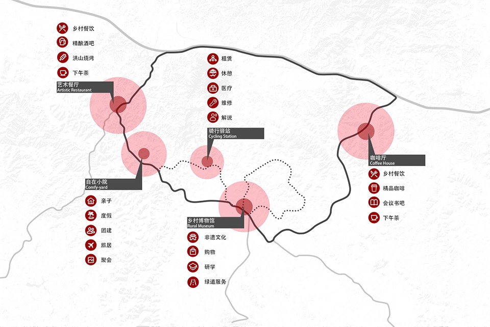 和美中心是五个和美乡村的示范点,均立足于乡村闲置资源的再利用,将其改造为骑行驿站、自在小院、乡村博物馆、咖啡厅和艺术餐厅,作为乡村的公共设施或度假居住产品。