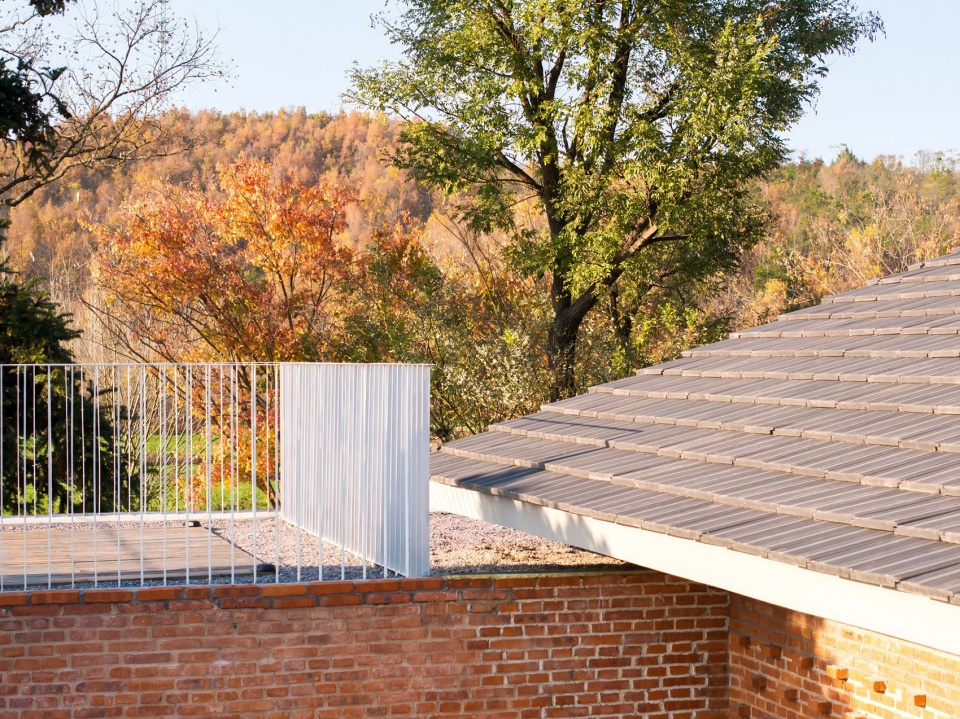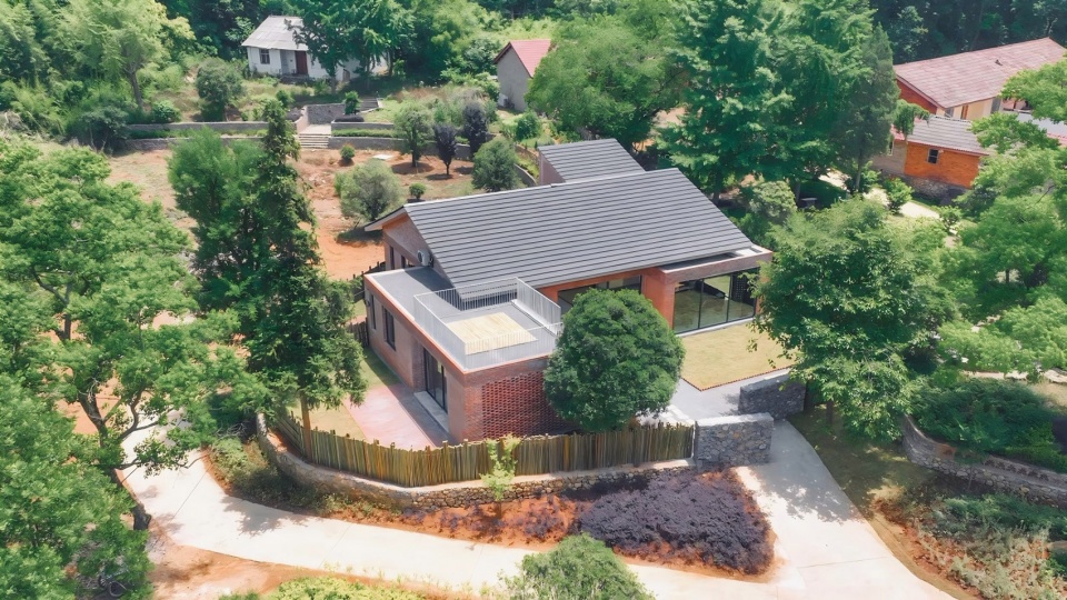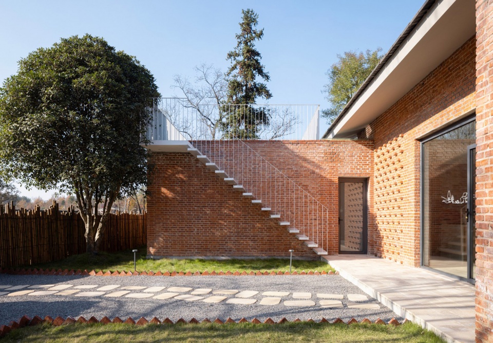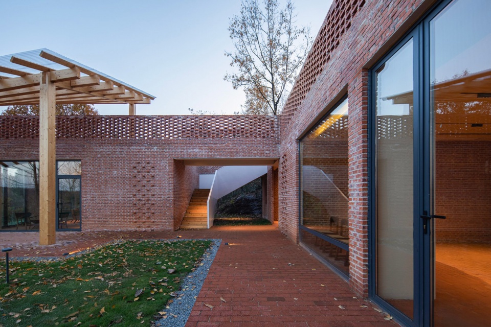 为了满足乡村宅基地的边界要求,并延续原有的场地肌理,新建建筑亦采用L型布置。场地南侧为公共院落,可从户外楼梯到达屋顶露台。北侧为三个独立的院子,为各间客房专属,均面向开阔的风景。主体建筑采用了坡屋顶,较大的挑檐遮挡雨水,并形成了入口的雨棚空间。室内设有两处公共空间,一处为客餐厅,一处为非遗工作室,大片落地窗结合镂空砖墙,遮挡视线的同时形成了特殊的景观。整栋建筑采用红砖作为建筑外墙材料,亦延续了骑行驿站的300厚复合墙体构造做法。