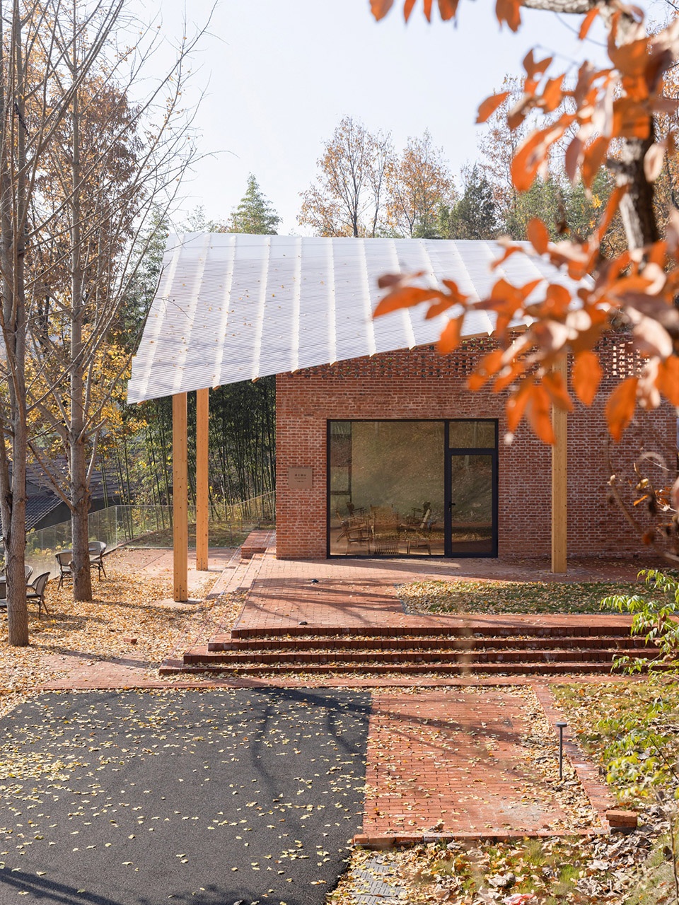主体建筑全部采用红砖建造而成,采用300厚复合墙体,内部有空腔,将混凝土构件隐藏在内,同时增强了墙体的保温性能。整个建筑犹如一个砖的容器,红砖延伸至室外形成广场和台阶,亦延伸至室内形成铺装。墙面局部使用了镂空或凸砖构造,形成丰富的光影效果。胶合木形成的直纹曲面构架,既作为咖啡厅的雨棚,也形成了驿站的视觉焦点。