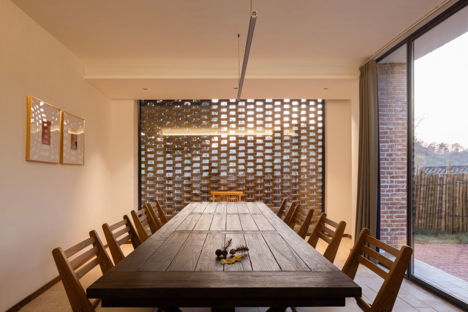 To comply with rural homestead boundaries and maintain the site’s original texture, the new structure also adopts an L-shaped layout. The southern yard is a communal space accessible via an outdoor staircase to the rooftop terrace, while the northern side features three private courtyards for the guest rooms, each opening to expansive views. The main building employs a pitched roof with deep eaves to shield against rain and create a sheltered entrance. Two shared spaces—a dining area and a heritage workshop—feature floor-to-ceiling windows paired with perforated brick walls, balancing privacy with curated views. Red bricks clad the exterior, continuing the 300mm composite wall technique from the Cycling Station.