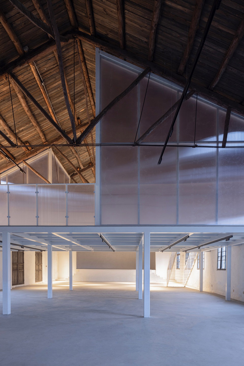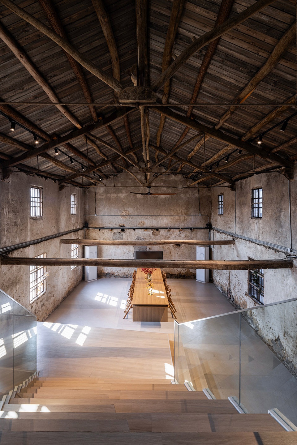 The renovation highlights coexistence. The old structure was stabilized with wooden braces, grouted cracks, and a refurbished roof with skylights. A glulam extension to the south, structurally independent, features a lattice frame and glass roof with bamboo slats to diffuse light.