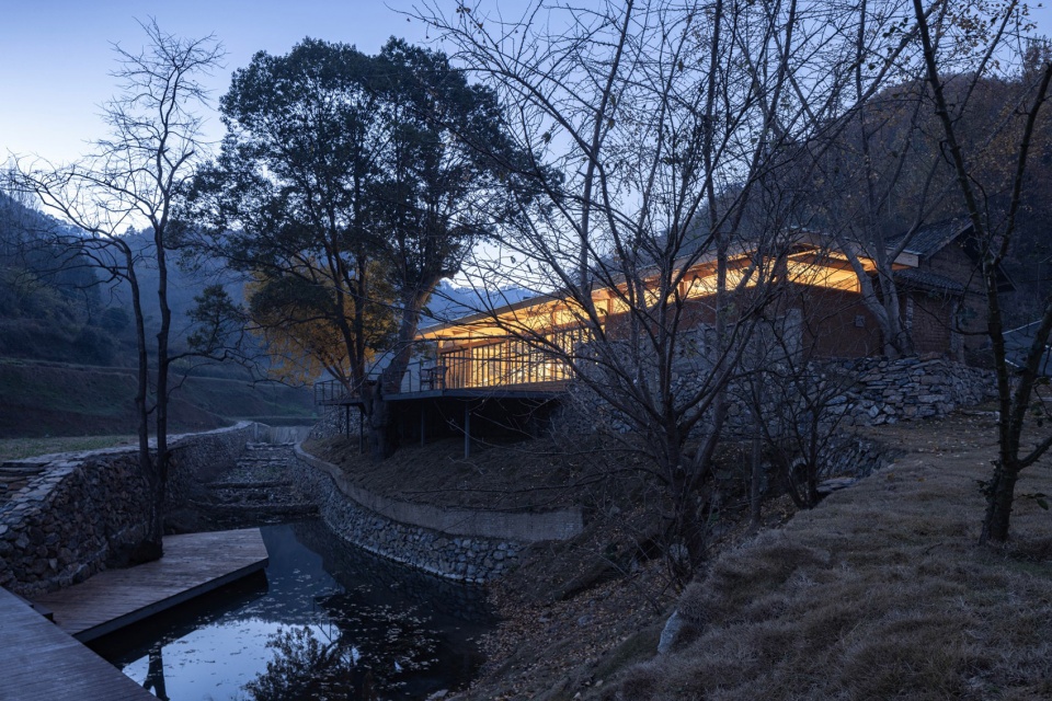 Repurposed as a Cafe House House and public space, the design leverages existing features. A steel platform cantilevers over the stream beneath the ginkgo tree for outdoor seating, while the old water source was transformed into a reflecting pool with a riverside trail.