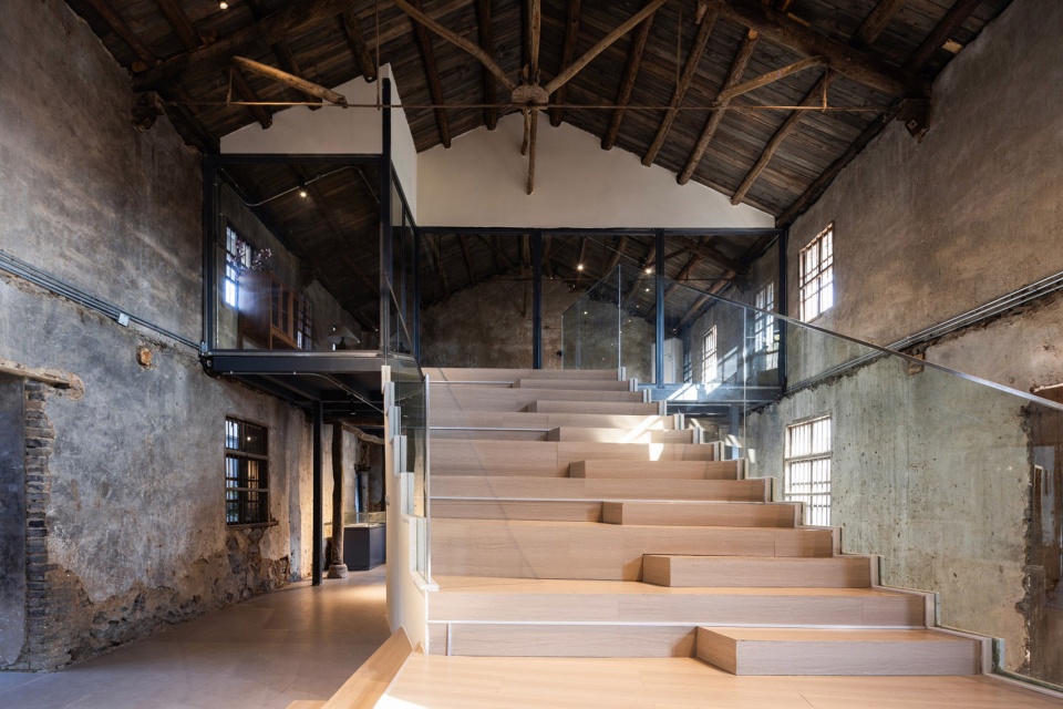 对厅屋内部和保留的墙体,采用了修改如旧的原则,保留了原有的木架和墙面肌理,对屋面进行翻新,增加了防水层,让钢木桁架的形式特征得以凸显。厅屋内部用钢结构加建了夹层,以满足功能的扩展需求。夹层下方的展示空间、楼梯端部的表演空间,都让建筑可适应多样化的空间需求。