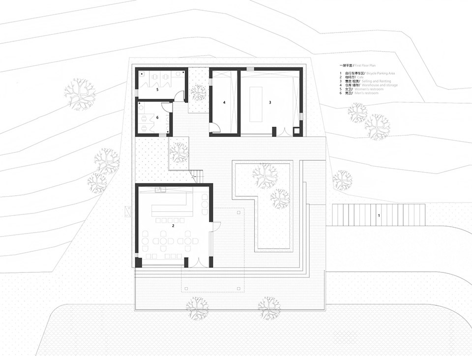 设计从地形的整治开始,东南侧引入一条自行车道,让户外爱好者可骑行至场地内。保留了原有的民居L型轮廓,留出一个方形的庭院,正对着两棵银杏树,让景观视野最大化。L型的中段设置一处户外楼梯到达屋顶,中间的天井利于自然通风。屋顶露台完全开放,可以布置咖啡外摆和远眺景观。