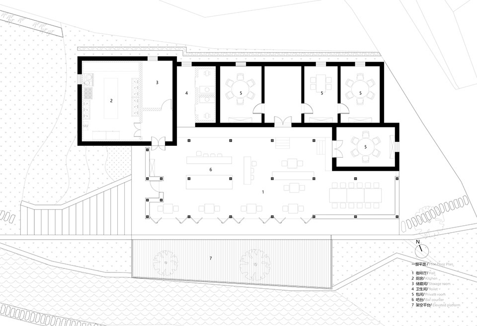 该地块定位为咖啡厅,打造乡村的公共空间,向游客提供咖啡、餐饮、多功能厅等服务。在场地的处理上,我们多利用现有的要素来形成的景观。在南侧,围绕银杏树修建钢结构平台,悬挑于溪流上方,作为户外的观景和休憩场所。在西侧,将废弃生活水源改造成景观水池,沿着溪流修建步道,在南侧形成了一个田野间的步行环线。