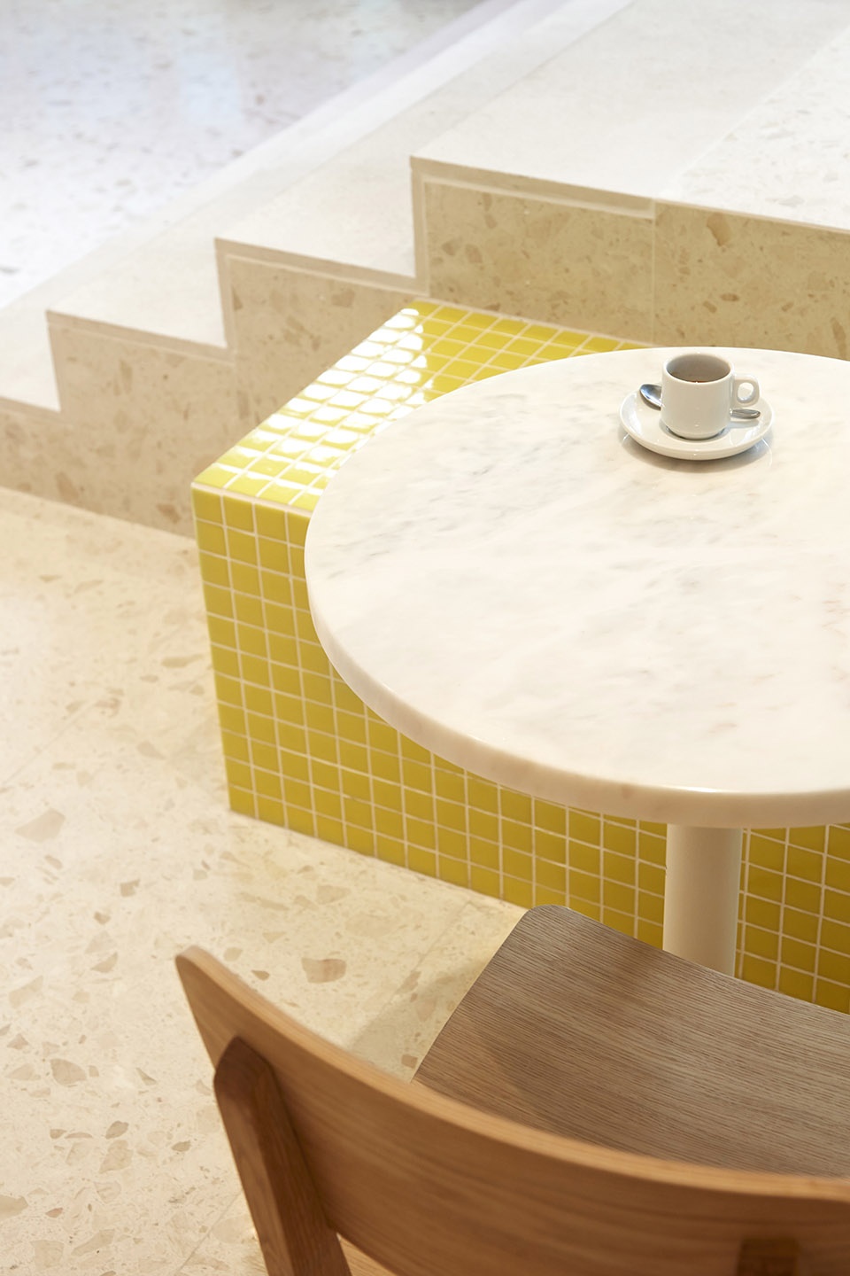 Their customized work for the interior of the patisserie included the design of all the furniture: a large mid-height table, two benches, a large display/grocery store and a high counter table. These elements, designed specifically for this space, are visible from both the inside and the outside. The simple and refined sizes, combined with geometric shapes, make the Studio Bom furniture both functional and aesthetic.