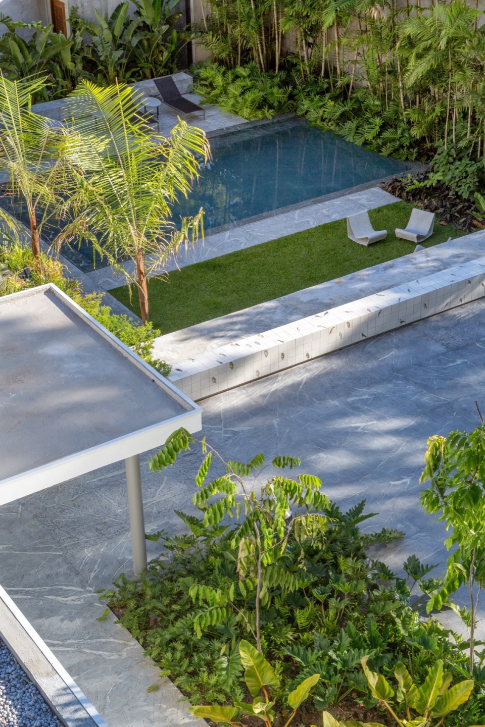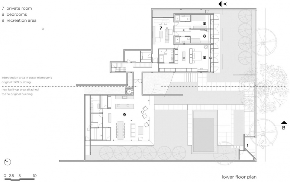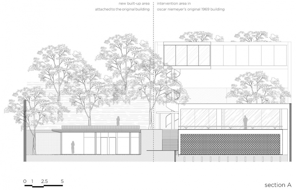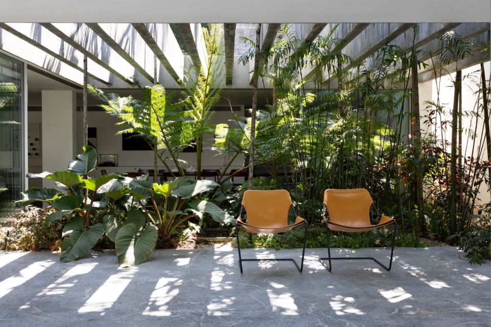 项目地块中原有一座奥斯卡·尼迈耶(Oscar Niemeyer)设计的住宅,因其位于都市核心区,体量相对紧凑。通过收购邻近地块,扩建后的改造介入得以改变城市景观,引入了一个新花园,其空间被周边环境的垂直与水平界限所界定。一座新的休闲附属建筑建于一道富有表现力的水平界面上,仿佛悬浮于泳池与花园之间。
