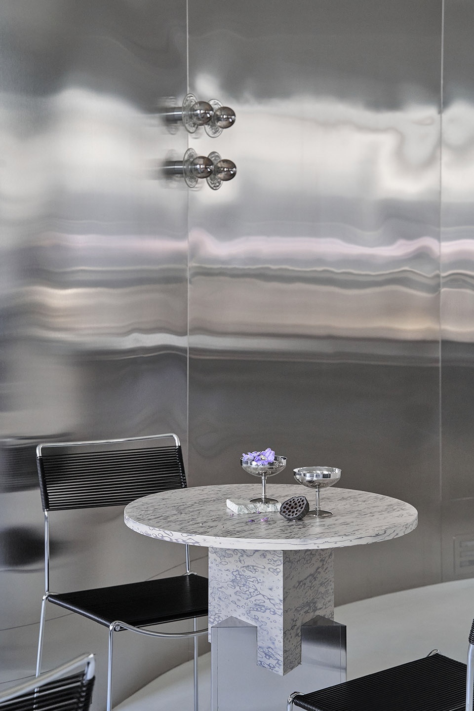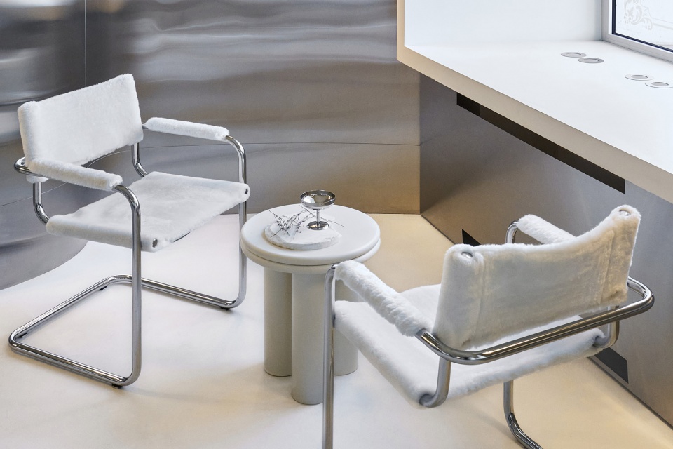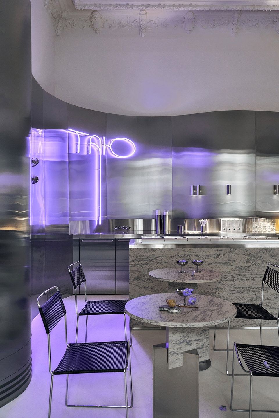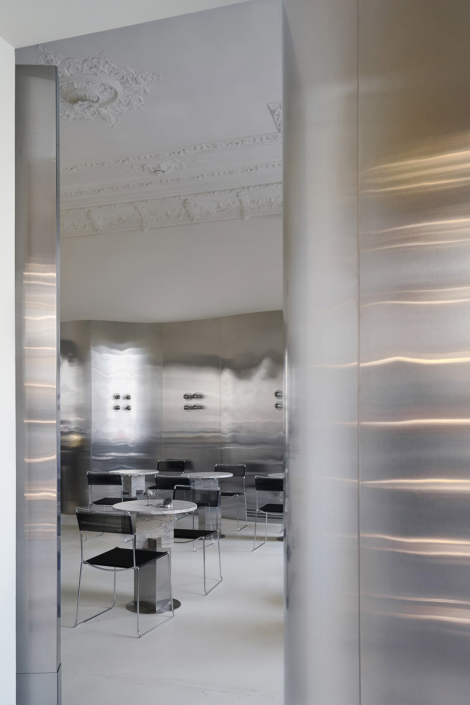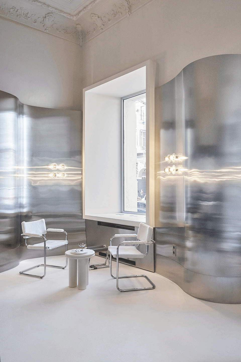 Therefore, the interior solution of one solid metal wave had to solve not only the aesthetic side but also reduce the timing of the interior. The name and the ice cream itself gave us the idea. The ice cream melts, the architecture of classicism melts and its massive decorative ceiling flows down into the smooth curves of the metal walls.