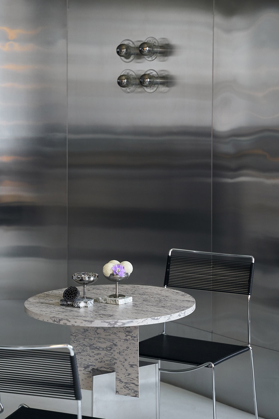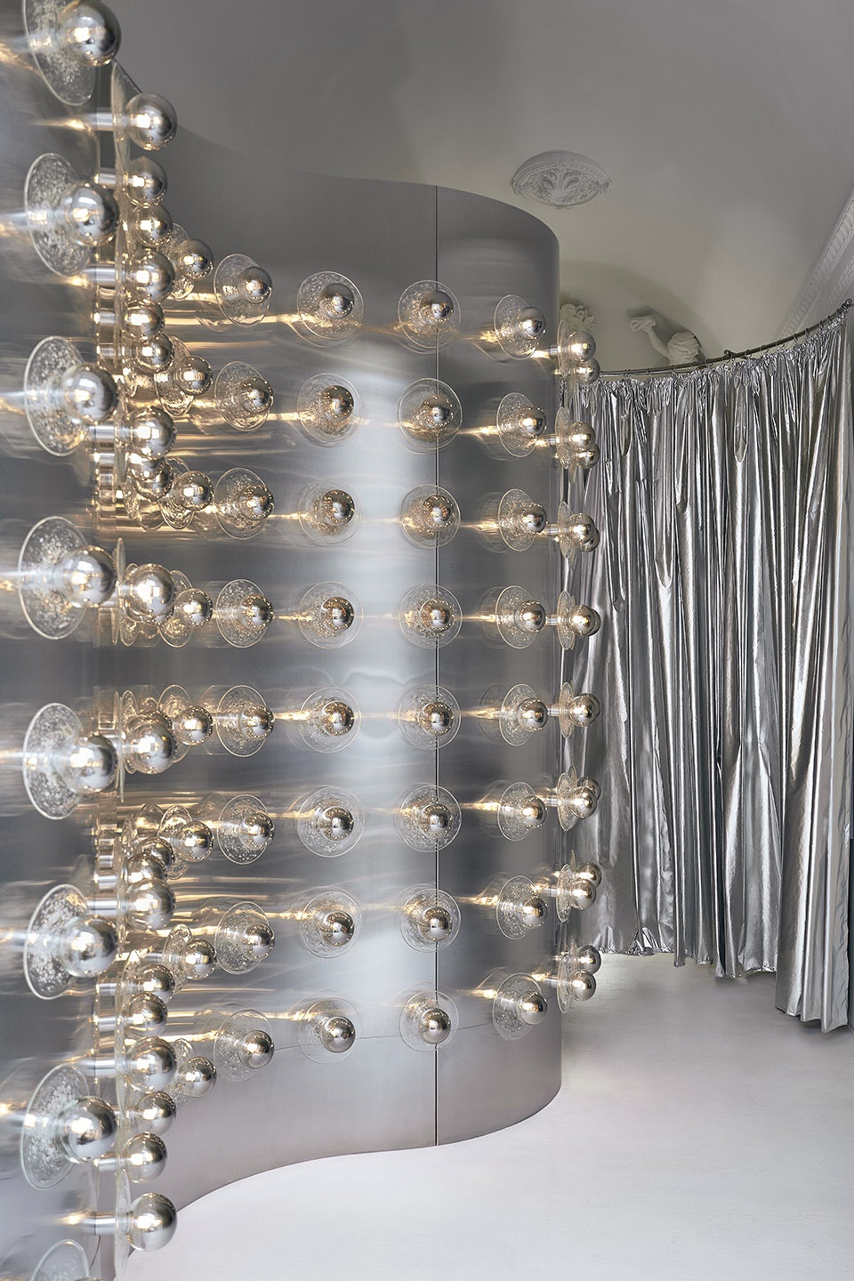 因此,这种连续金属波浪形态的室内方案不仅要解决美学问题,也要缩短施工时间。店名和冰淇淋本身给了我们灵感。冰淇淋会融化,古典主义建筑也在“融化”,原本厚重的装饰性天花板仿佛在融化,顺着金属墙面的柔和曲线流淌下来。