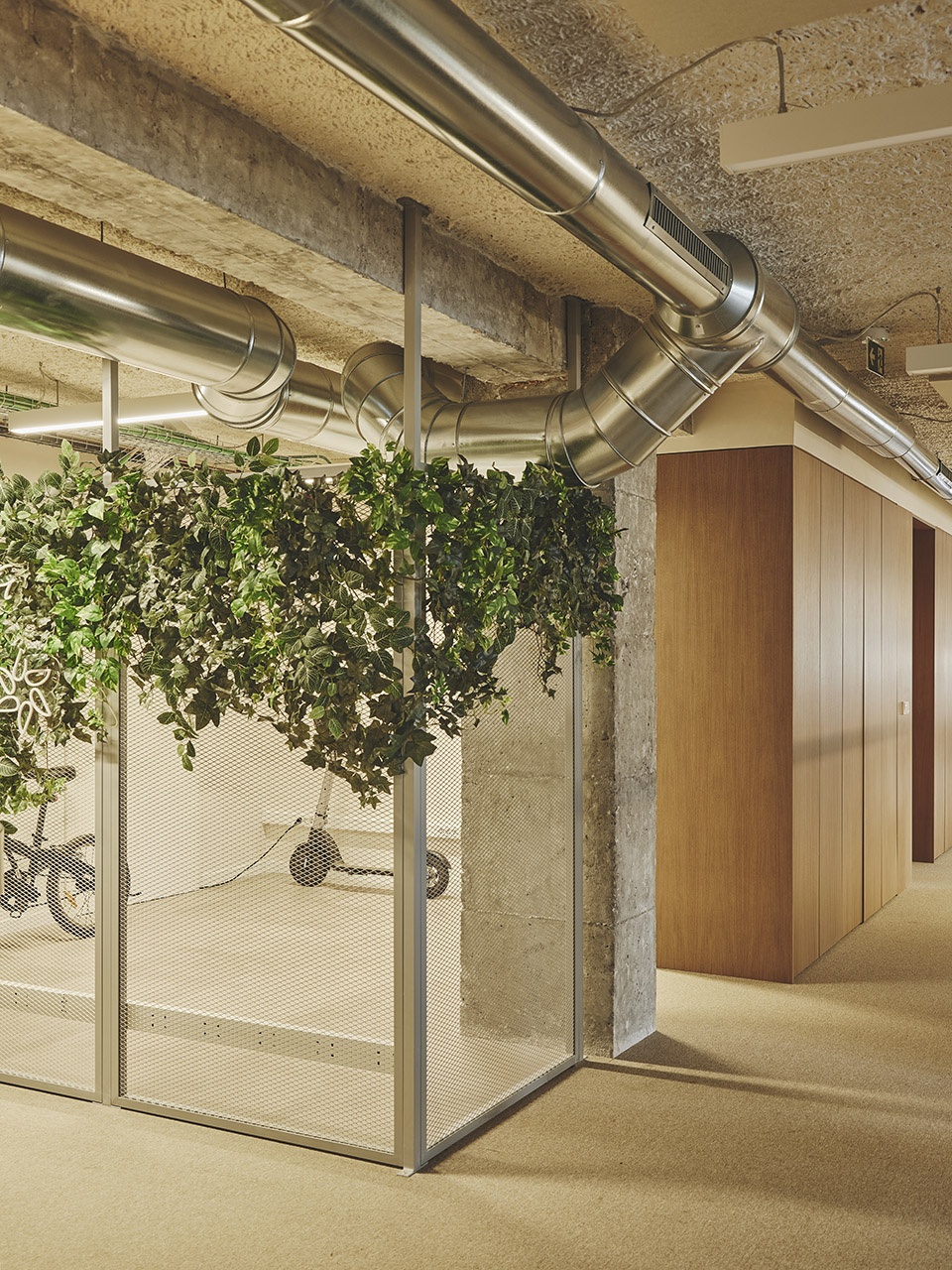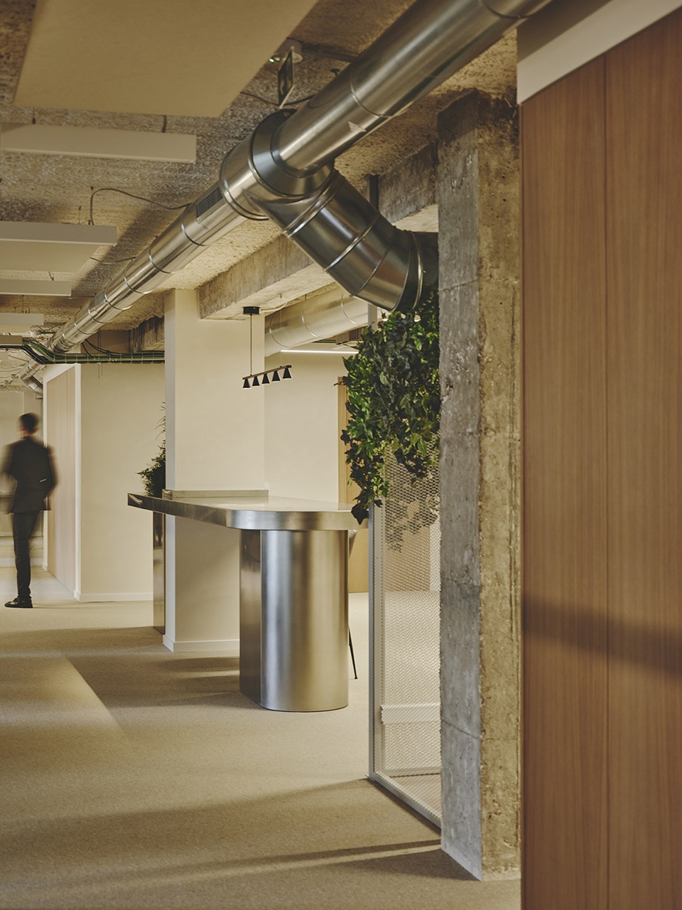 鉴于天花板高度有限,空调管道、通风系统、电气与数据线路等设备均采用裸露式设计。这一技术性策略赋予办公空间一种原始而现代的视觉特征,再辅以不锈钢材质、喷涂保温天花板和自然木材,营造出年轻、科技感强烈的氛围。这种偏冷、工业感的材质体系通过丰富的绿色植物和橙色、黄色等鲜艳色彩的家具软装得到中和,特别体现在连接各办公区的休闲交汇空间中。