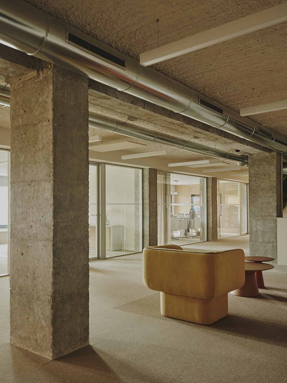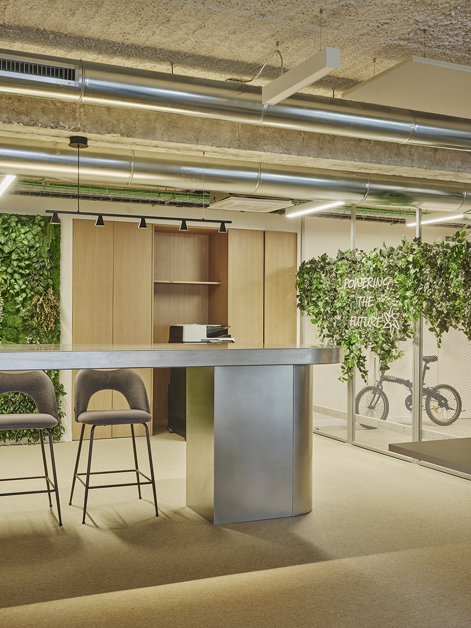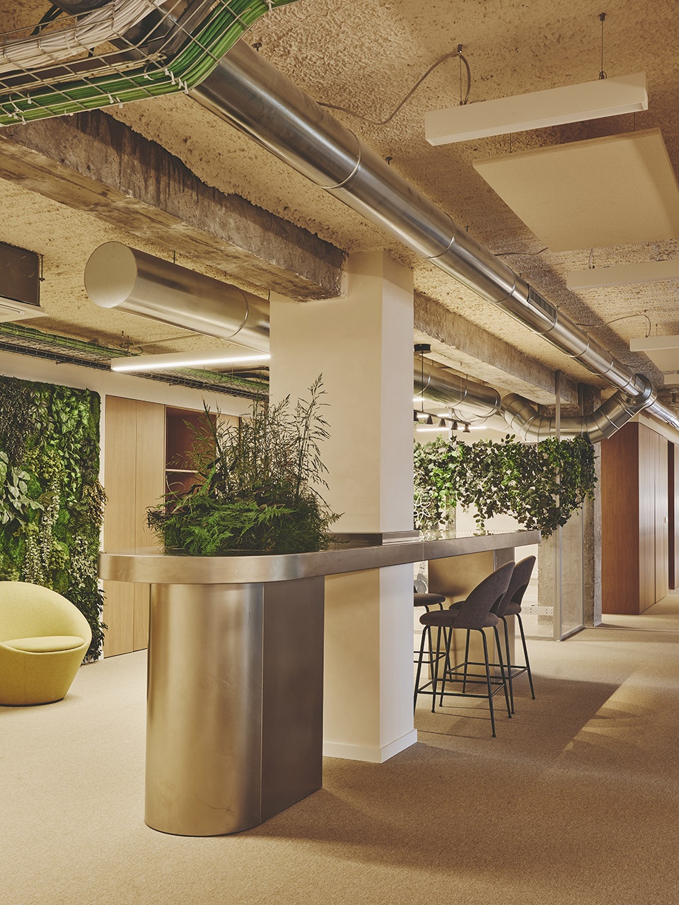 Due to the low ceiling height, all installations – AC ducts, ventilation systems, electrical and data systems – are left exposed. This technical solution already lends an aesthetic character to the offices, resulting in a youthful and technological appearance complemented by raw materials like stainless steel, spray insulation ceilings, and natural timber. This cold, raw material palette is balanced with vibrant elements, such as abundant greenery and furniture upholstered in bold colors like orange and yellow, especially in the occasional areas that connect different work zones.