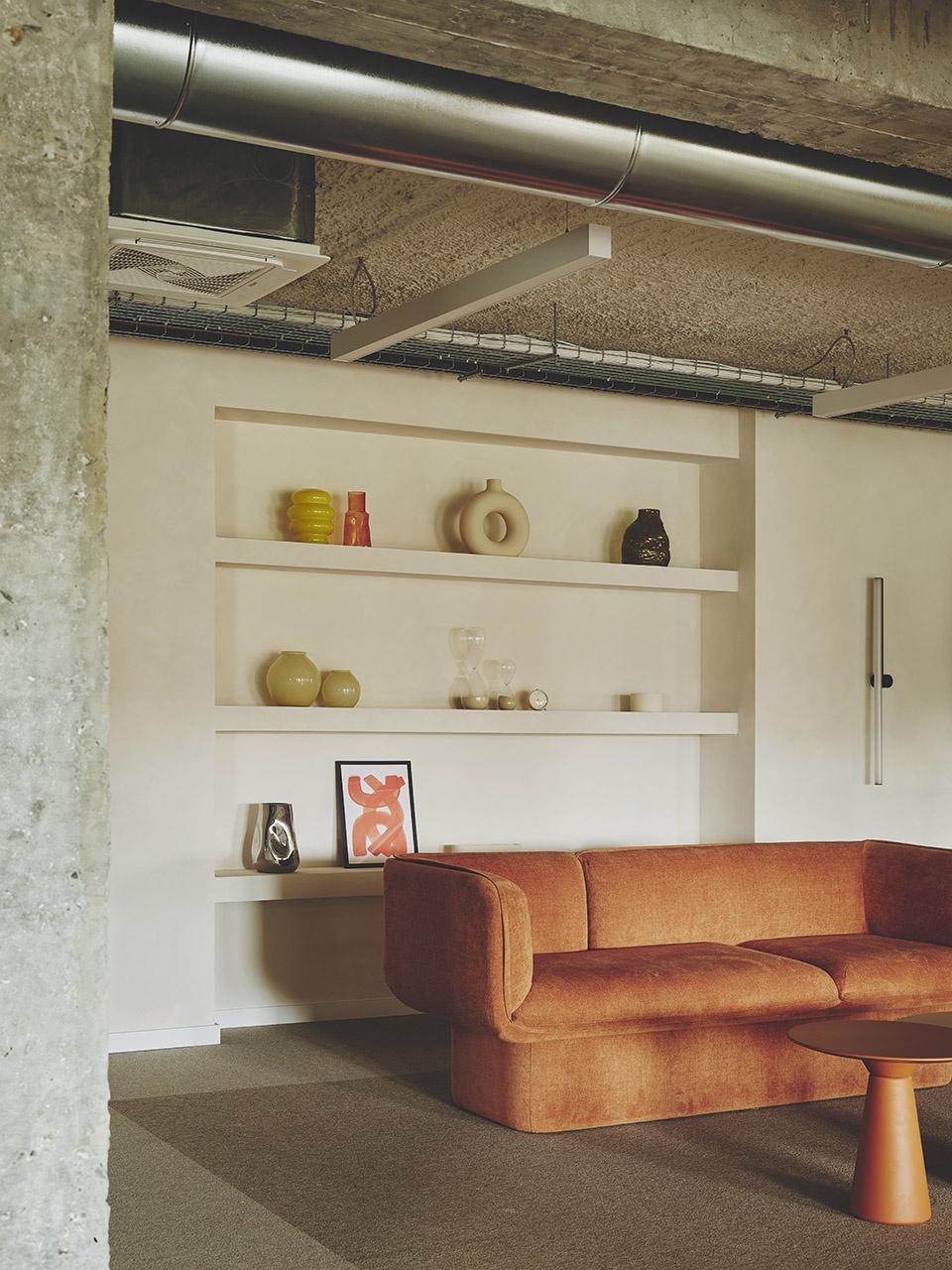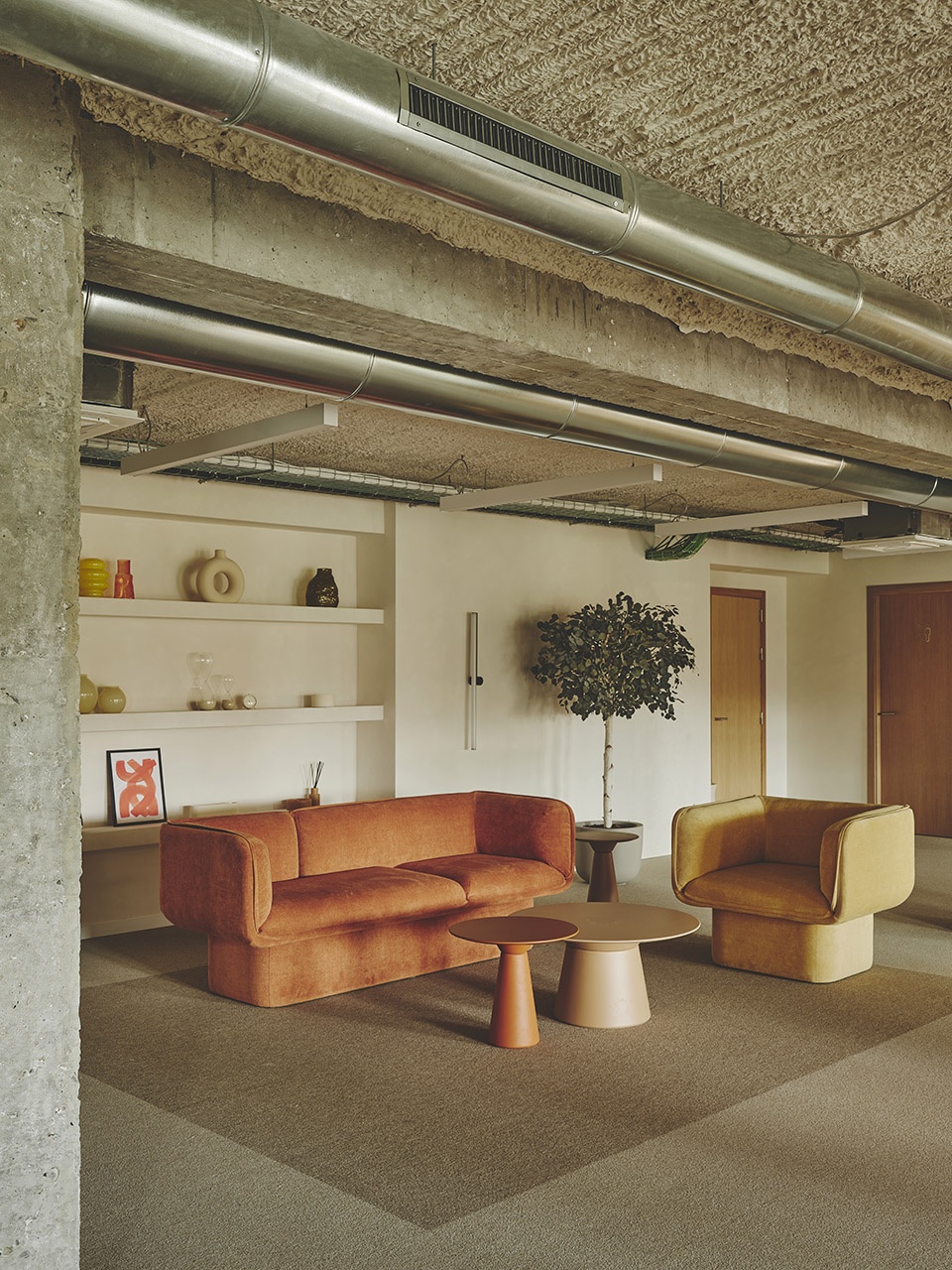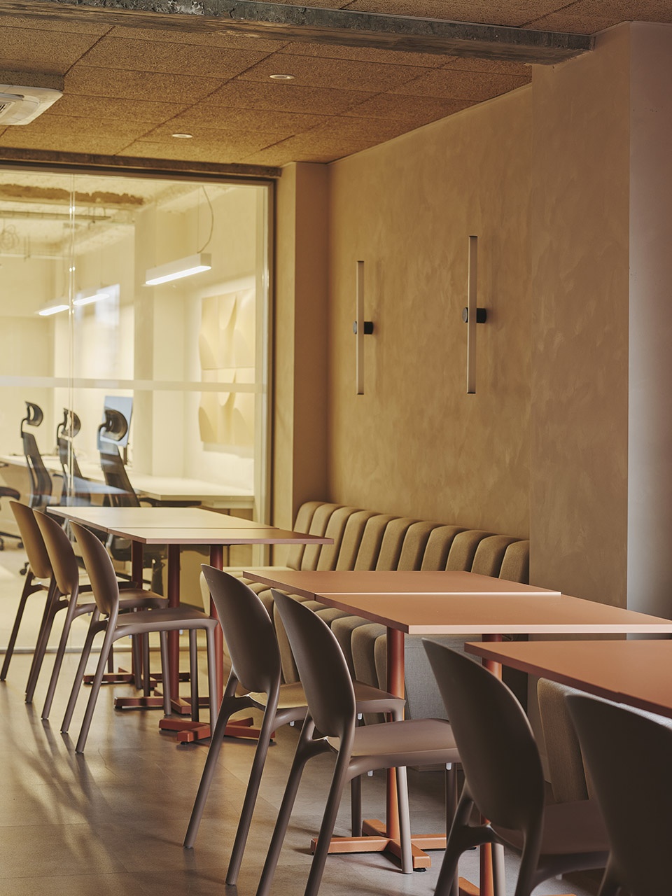 Due to the low ceiling height, all installations – AC ducts, ventilation systems, electrical and data systems – are left exposed. This technical solution already lends an aesthetic character to the offices, resulting in a youthful and technological appearance complemented by raw materials like stainless steel, spray insulation ceilings, and natural timber. This cold, raw material palette is balanced with vibrant elements, such as abundant greenery and furniture upholstered in bold colors like orange and yellow, especially in the occasional areas that connect different work zones.