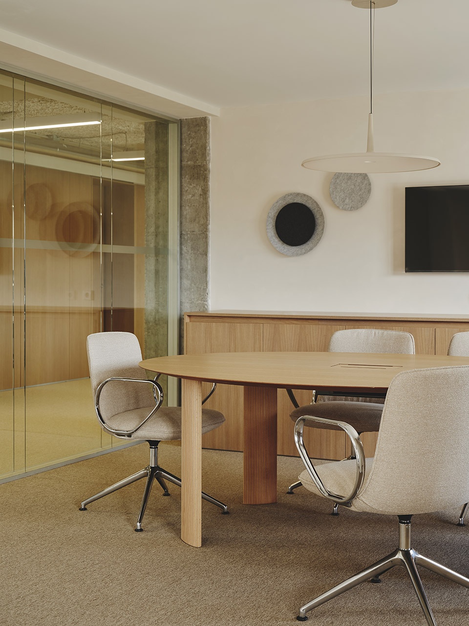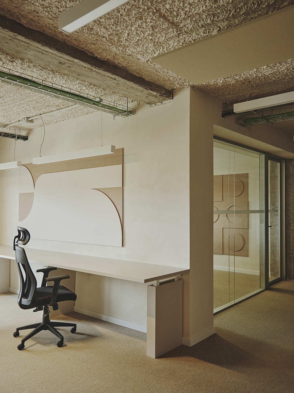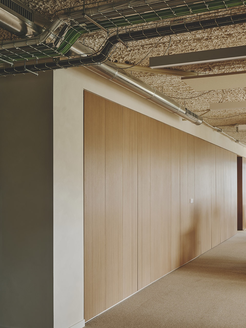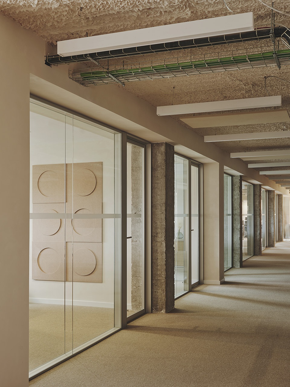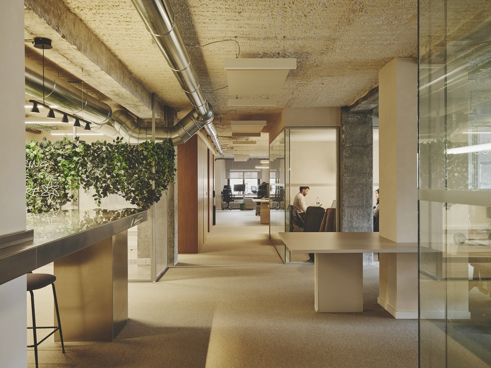 Special emphasis was placed on the acoustics of the office, which are crucial in a space with such a large capacity. Carpets on the floor, textured ceiling surfaces, upholstery, vegetation, and double-glazed partitions all contribute to sound control in the space.