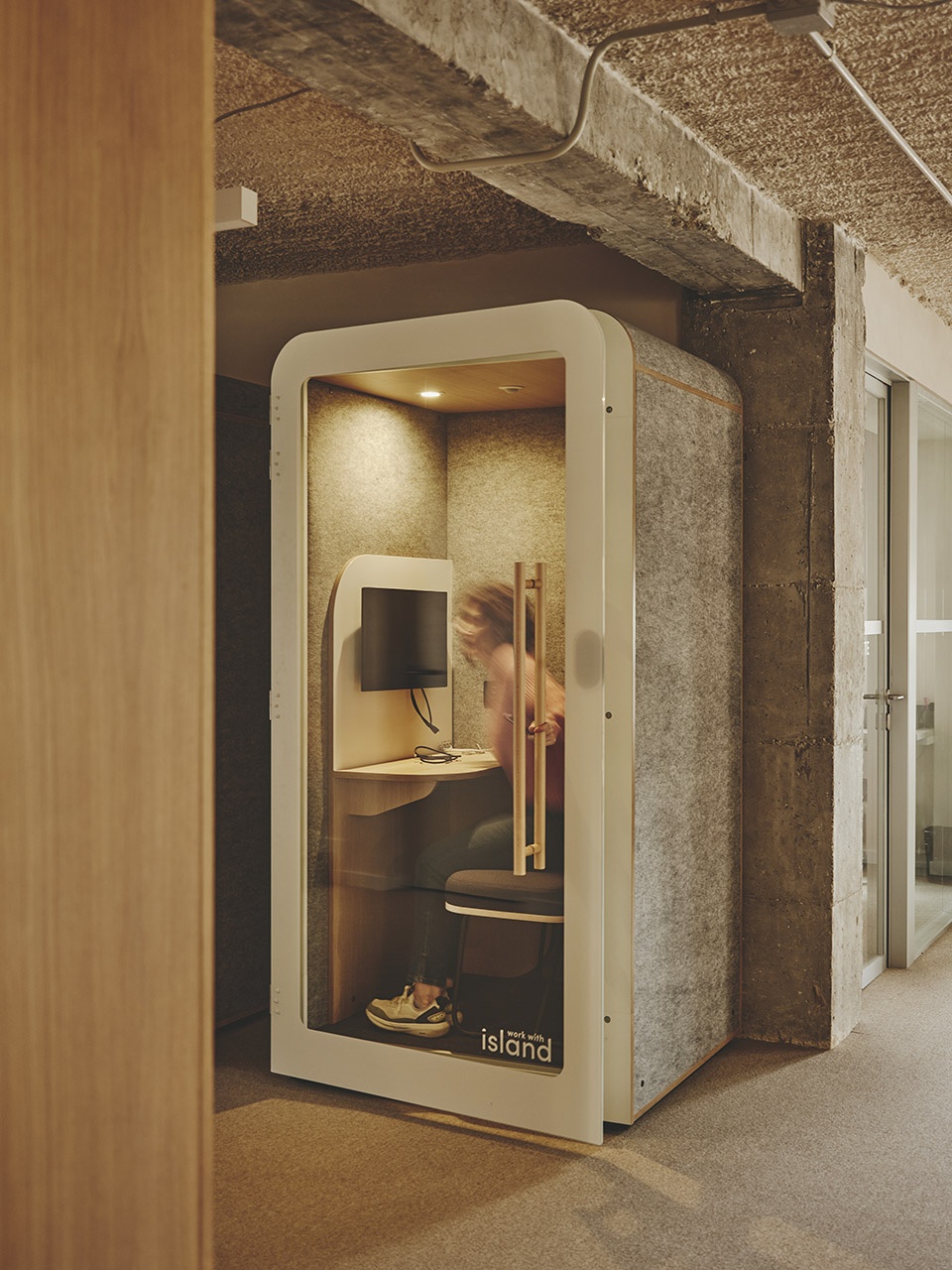 项目还特别关注声学性能,这在一个高容量空间内尤为重要。地面铺设地毯、天花使用纹理材料、家具软包、植物装饰以及双层玻璃隔断等手段,共同营造了良好的声音控制环境。