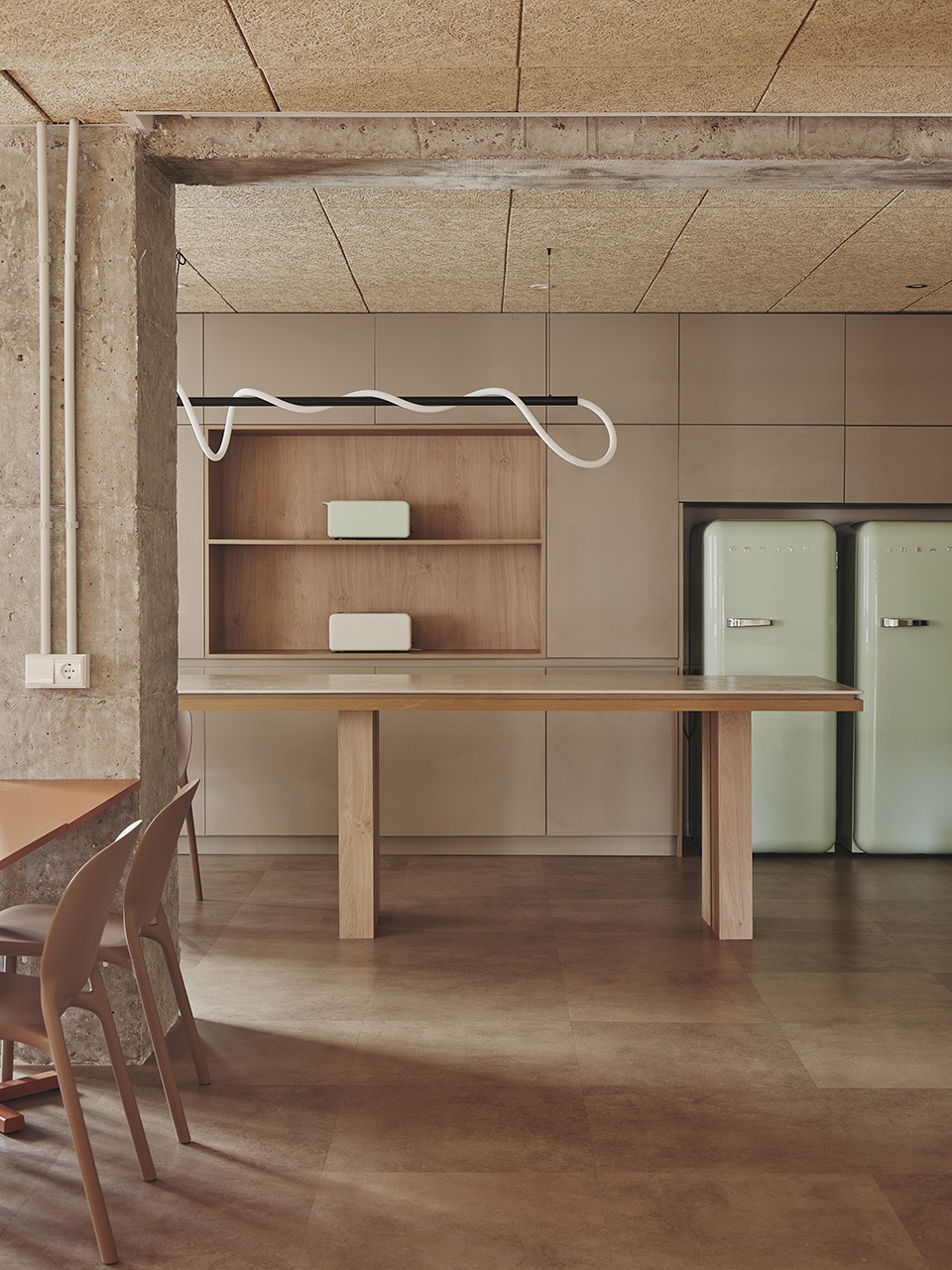 Prosolia总部的设计任务是一项挑战:在一个天花板较低、内部密集分布着80多根柱子的空间内,为70名员工打造一处面积达1000平方米的办公场所。这片被称作“混凝土森林”的空间中,一侧立面却拥有俯瞰瓦伦西亚图里亚花园的广阔视野。