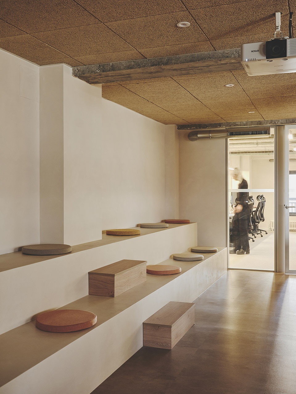 The other wing of the office hosts the working stations, along with internal meeting rooms, a parking area for scooters and bikes, and some phone booths. A unique space between these two wings is the large multipurpose dining hall, which also functions as an auditorium for company internal meetings thanks to the bleachers running along one of its sides.