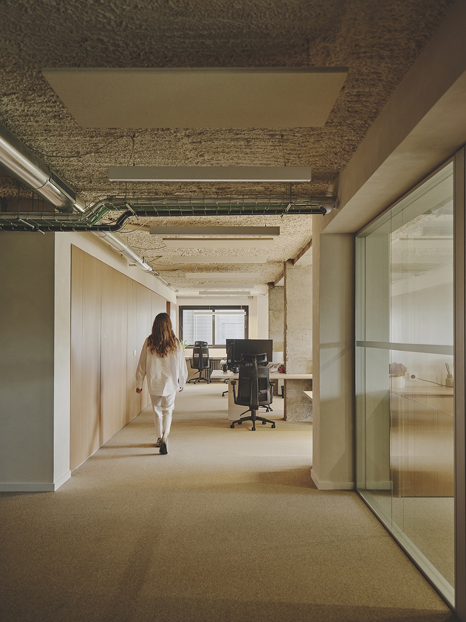 Prosolia Headquarters consisted a challenge of creating a 1,000 sqm workspace for 70 employees in a spot with low ceilings and more than 80 pillars spaced closely together. One of the facades of this “concrete forest” however, offers a wide view over the Turia Gardens in Valencia.