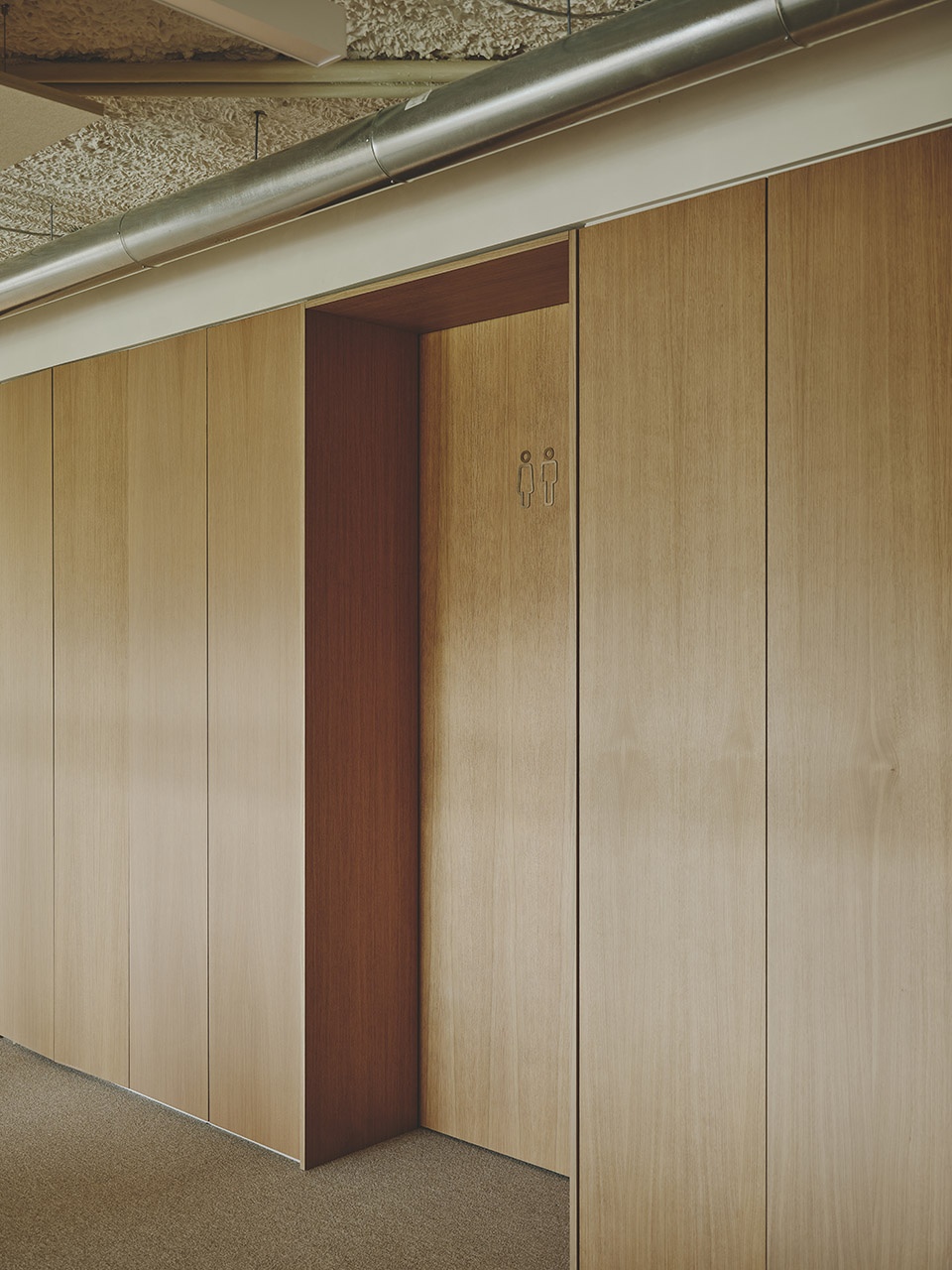 办公空间的另一翼布置了工位区、内部会议室、电动车和自行车停车区,以及若干电话亭。连接这两翼之间的是一处多功能餐厅,其一侧设有阶梯看台,可用作公司内部会议的礼堂空间。