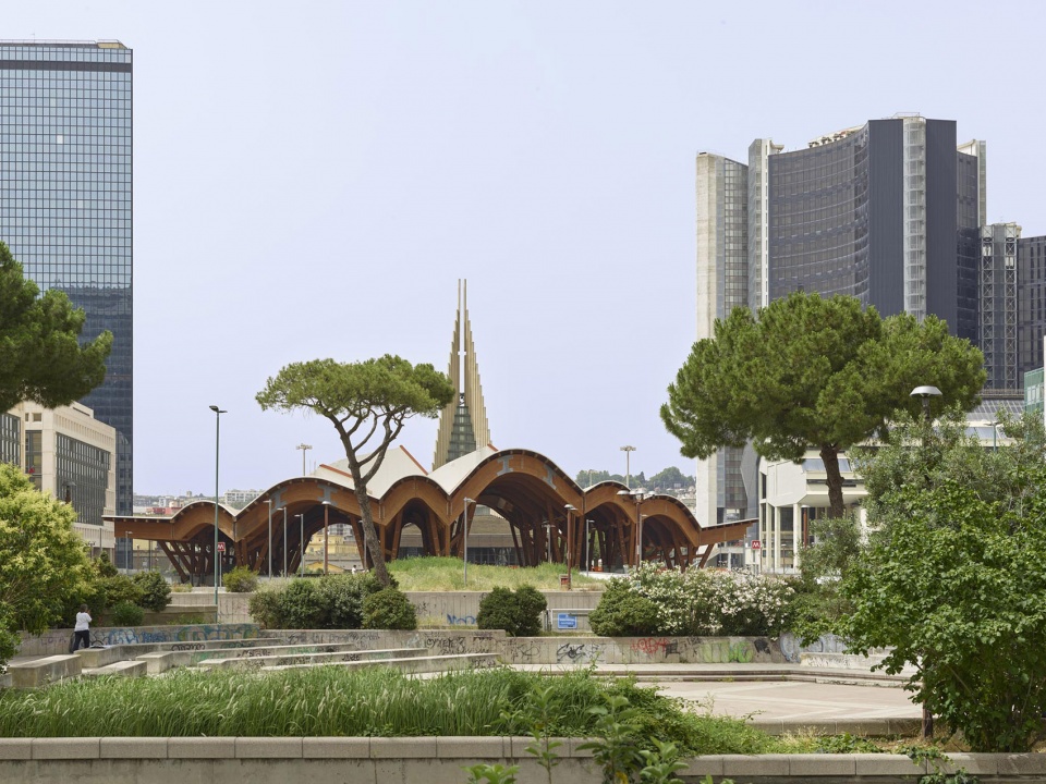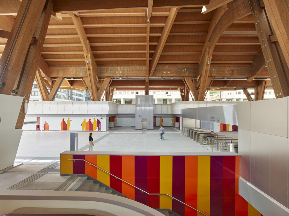 One of the decisions of the project was to build the station with wood to create an organic contrast with the 1970s neighbourhood. The design of the new station was inspired by older areas of Naples.Today, it is a place where there are many offices and commercial spaces, but at five o’clock in the afternoon, it is deserted making it an unsafe place. So, the idea of making a new station there and connecting it to the new metro line was also to try to introduce a piece of nature and a piece of the original part of Naples into this artificial part of the city. The new station is being built over the existing metro lines, replacing an earlier building that was little more than a cover for the stairs leading down to the metro platforms.