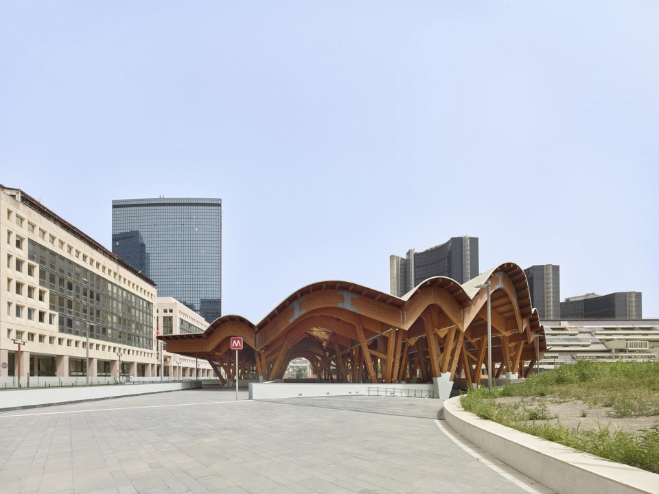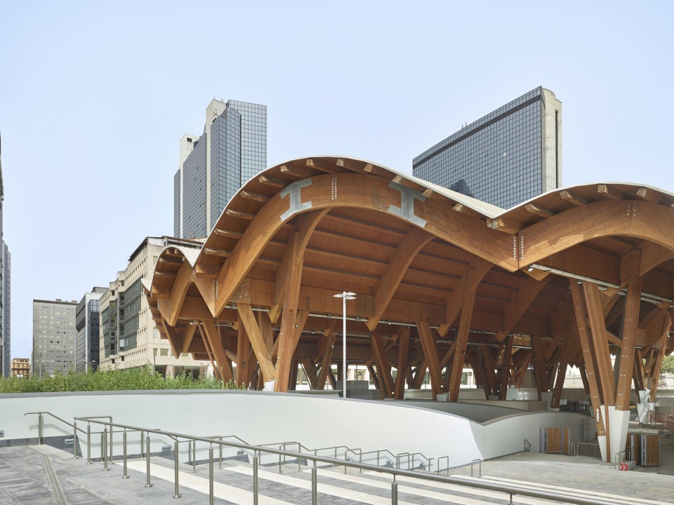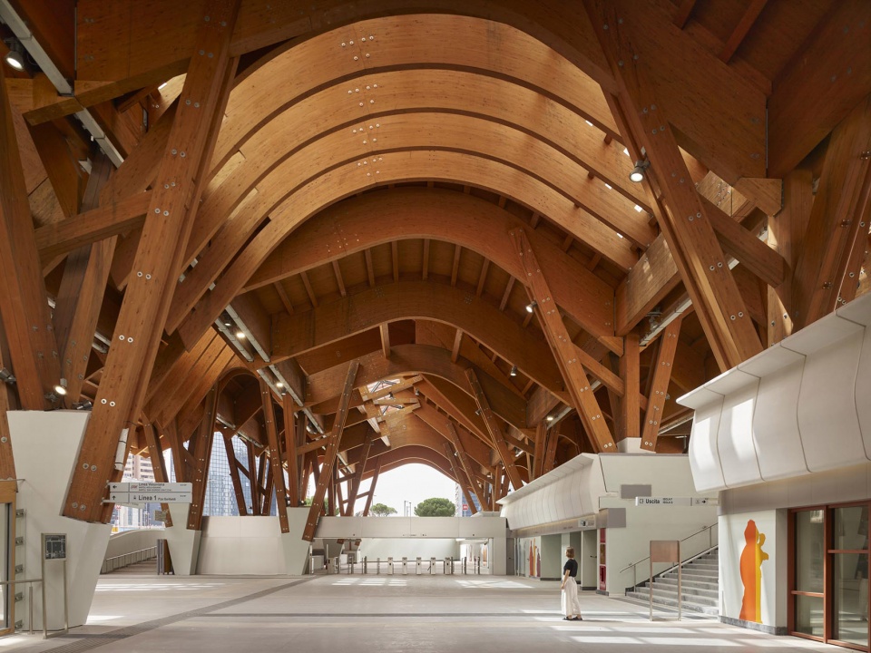 Wood is a very light material that blends perfectly with the pre-existing structures: we used the concrete structures and columns and inserted new wooden columns into them. The steel part of the concrete matches to make the base of the new columns, and then the rest of the column is entirely made of wood. The characteristic shape of the 10,000 sqm station is made of glued laminated timber. The width of the train tracks below is reflected in the width of the undulating vaults.