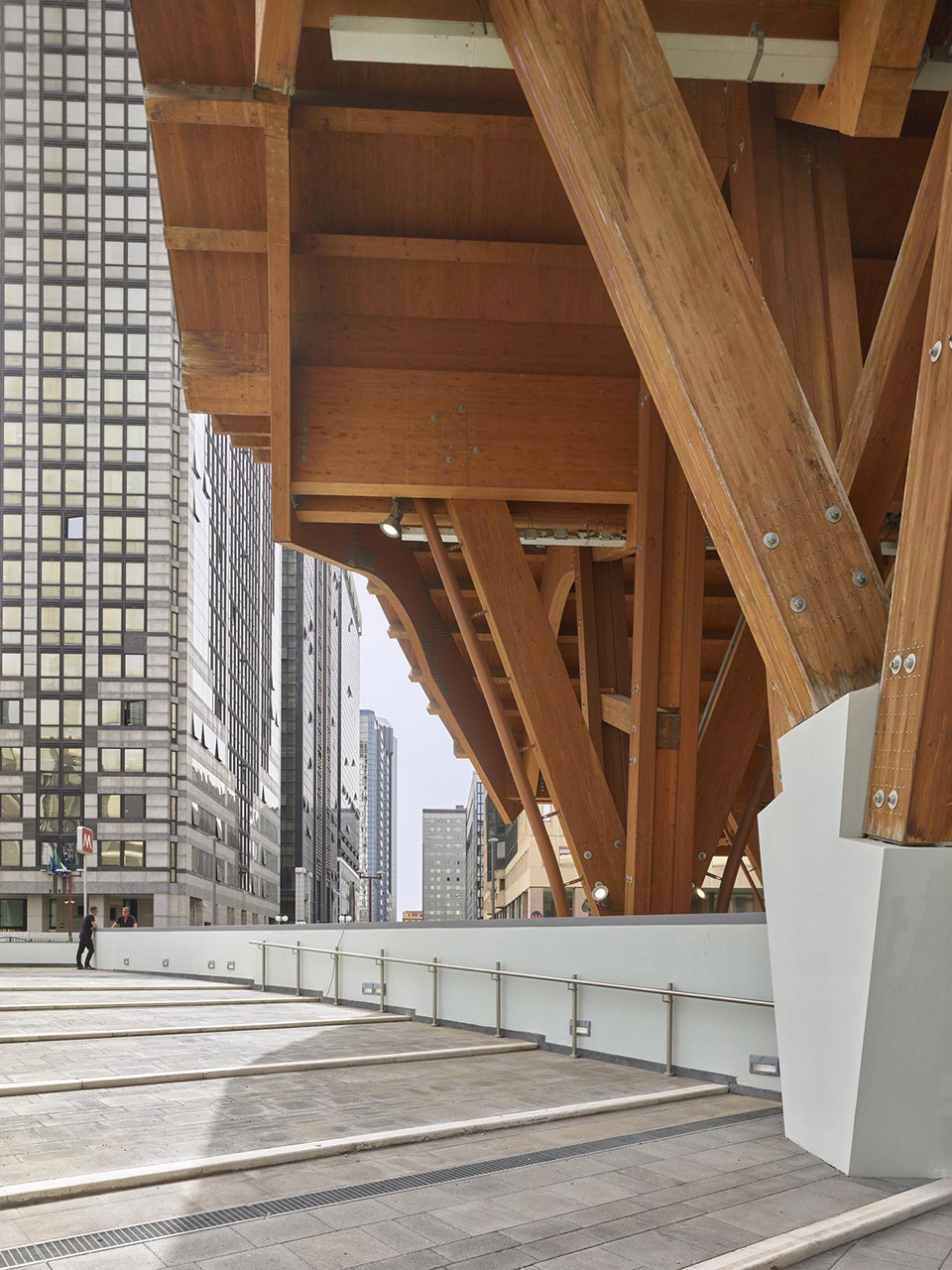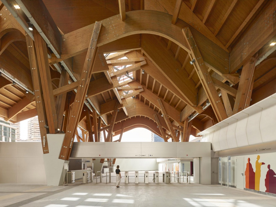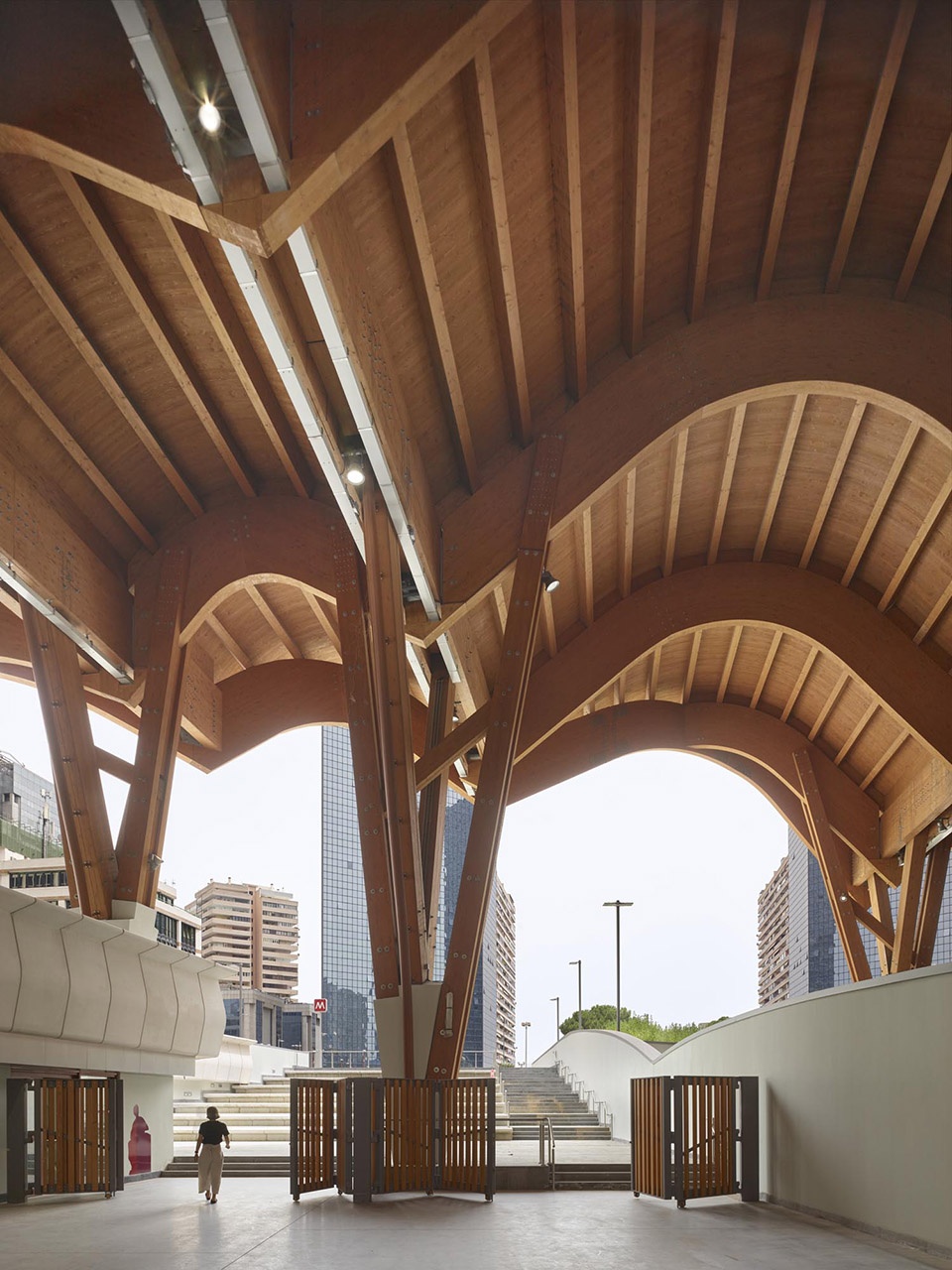 拱顶是EMBT建筑事务所的标志性设计元素之一,这种结构形式适用于多种材料——历史上曾以石材和陶瓷建造,如今也非常适用于木材,尤其是可塑性极强的胶合层压木,可以根据需要塑造成任何形状。拱形天花也向传统火车站的经典元素致敬,而整个车站的造型则意在营造出“林间漫步”的感受。某种意义上说,我们试图打造一种新的、有机流动的城市广场空间,让人在人工化的商务中心中也仿佛置身于森林之中。