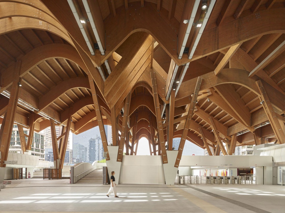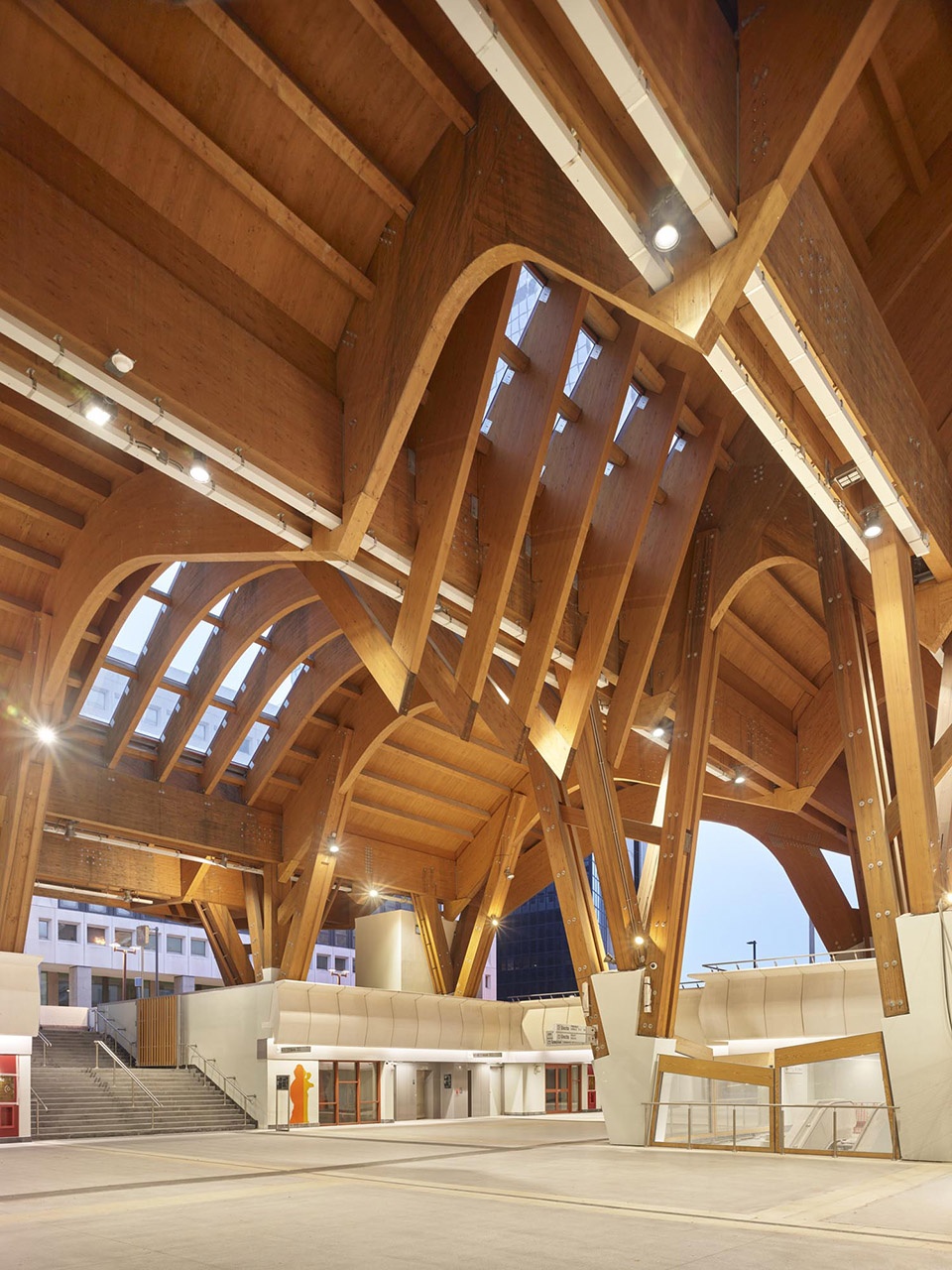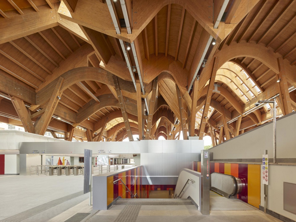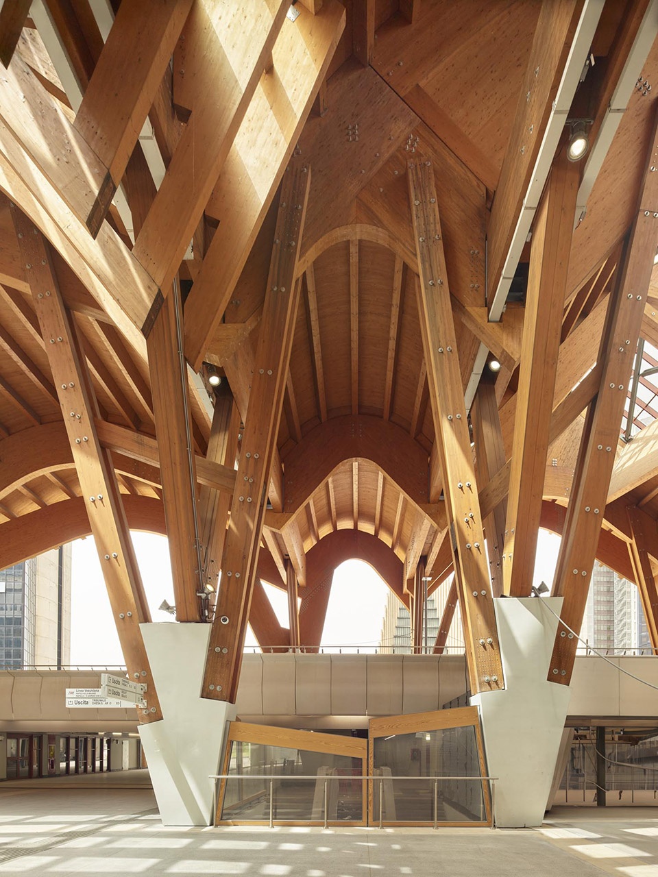 木材作为轻质材料,能够很好地融入既有结构中。设计中保留了原有的混凝土结构与柱体,并在其中嵌入新的木柱。混凝土结构中的钢材部分用于作为新柱的基座,其余部分则完全由木材构成。这座面积达1万平方米的新车站以胶合层压木为主要结构材料,其波浪状拱顶的宽度与下方铁轨的宽度相呼应。