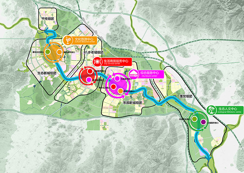 四心拥江的空间平台:以贺江为脊,打造八步老城生活商贸中心、八步新城综合服务中心、生态新城文化旅游中心、莲贺组团生态人文中心的“一带四心,拥江发展”的结构。