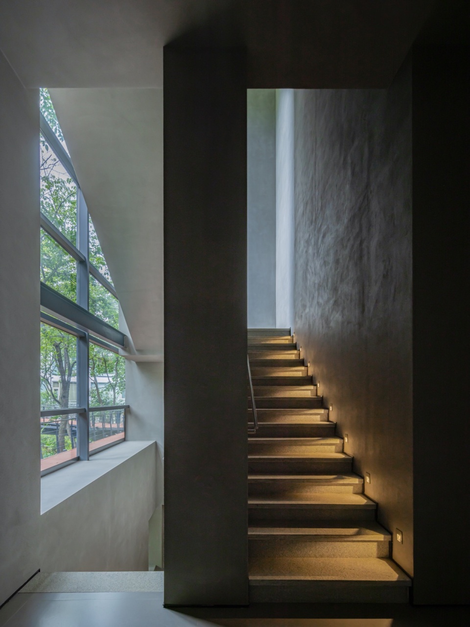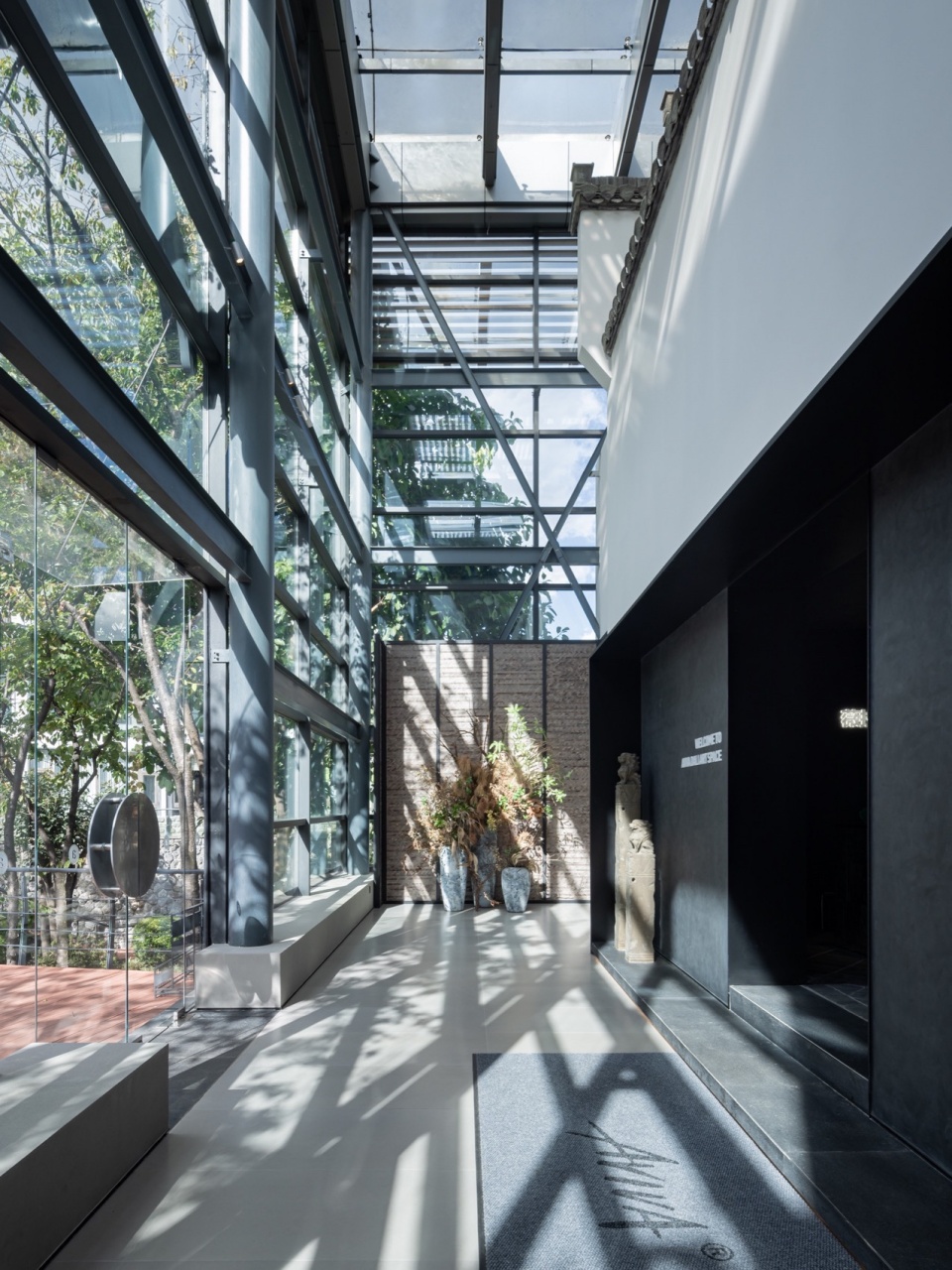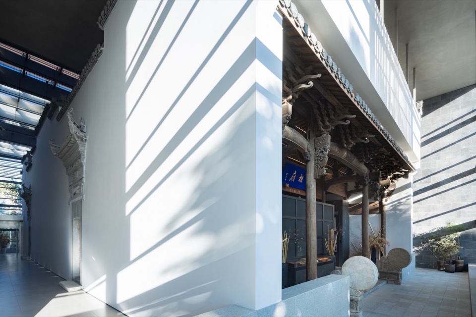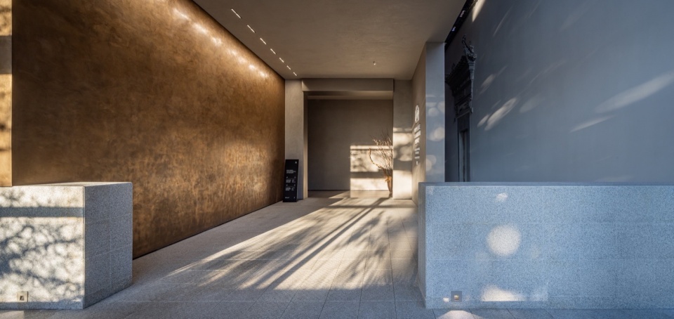 承袭东方人文历史沉淀,呈现克制的极简本质,高透光的玻璃外立面使得光线可照入室内,修复使用最简单的白漆饰面,树影投射仿佛在白墙上作画,漫反射光营造自然归真的空间。