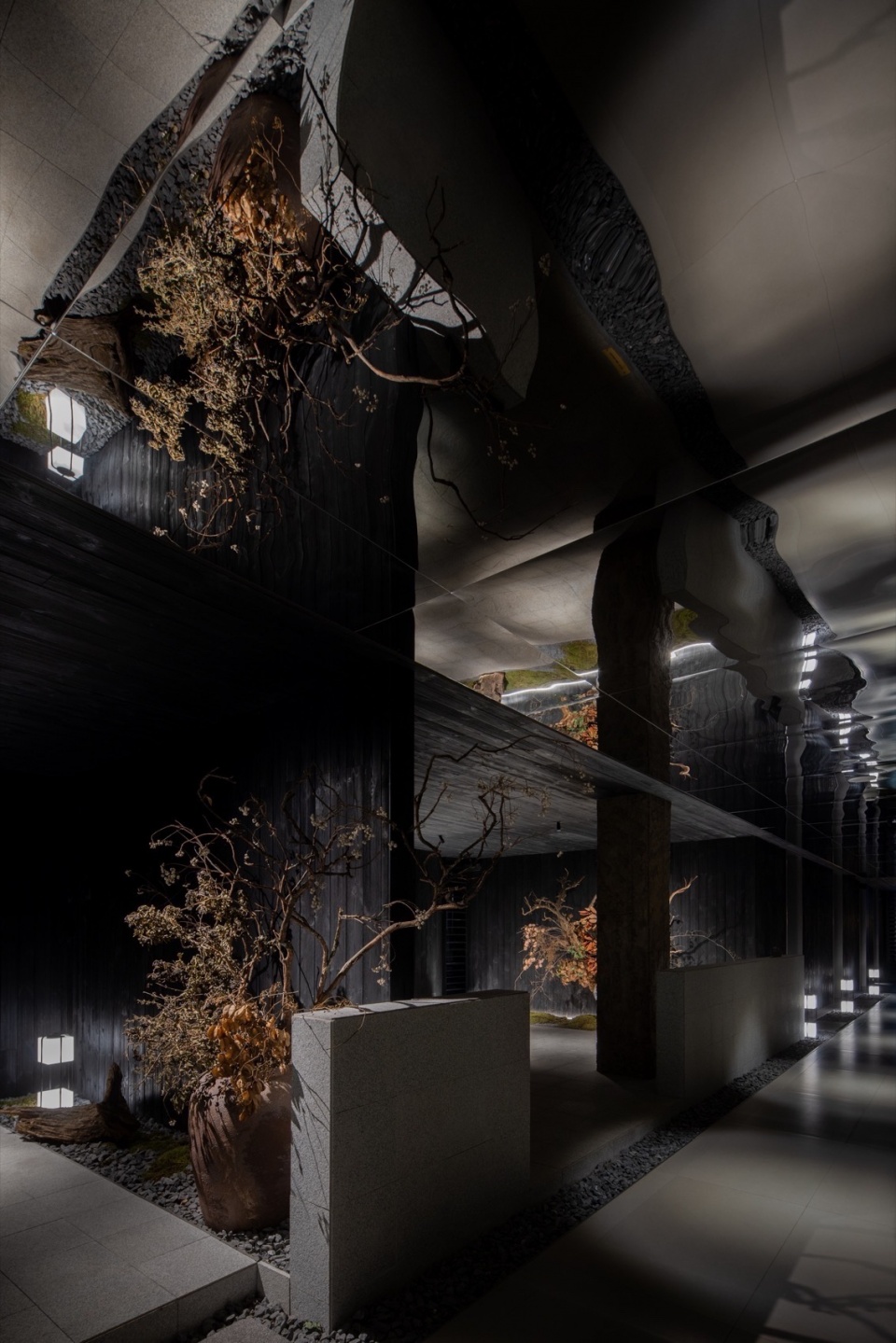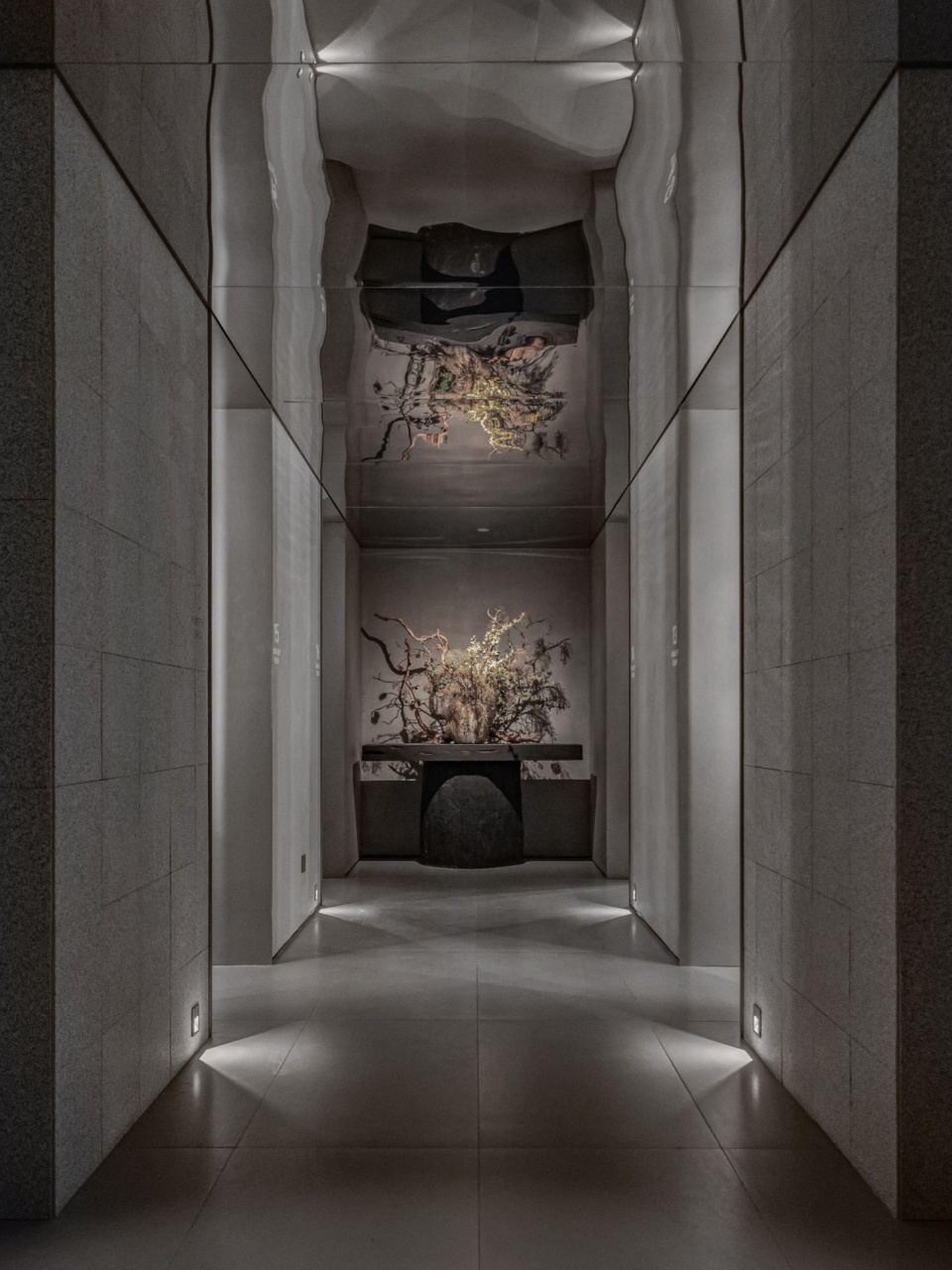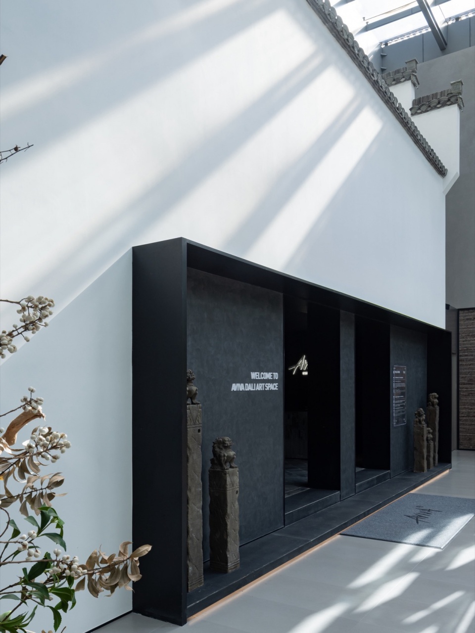 In commercial exhibition zones, low courtyard walls replace internal partitions. Light permeates through translucent screens, making classical/modern and reality/fantasy interplay within this art-grade exhibition space.