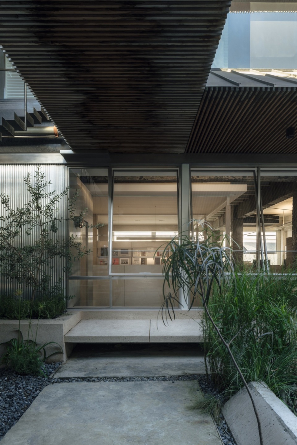 在空间的入口处,我们以相同材质的现浇混凝土来同时构建室外地台与入门玄关,进一步弱化室内外之间的界限,增加视觉的连续性。
