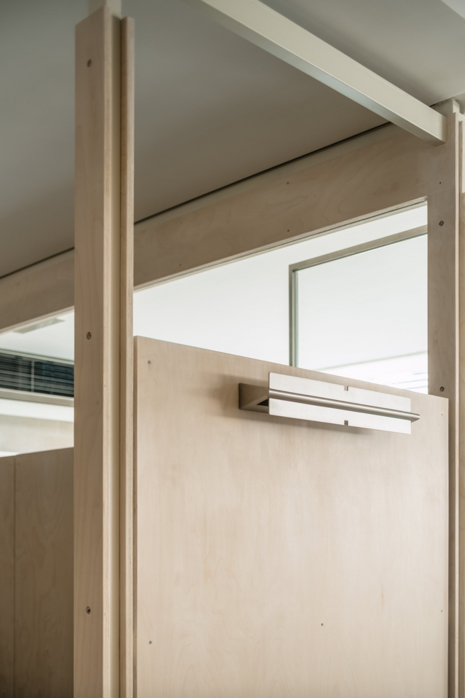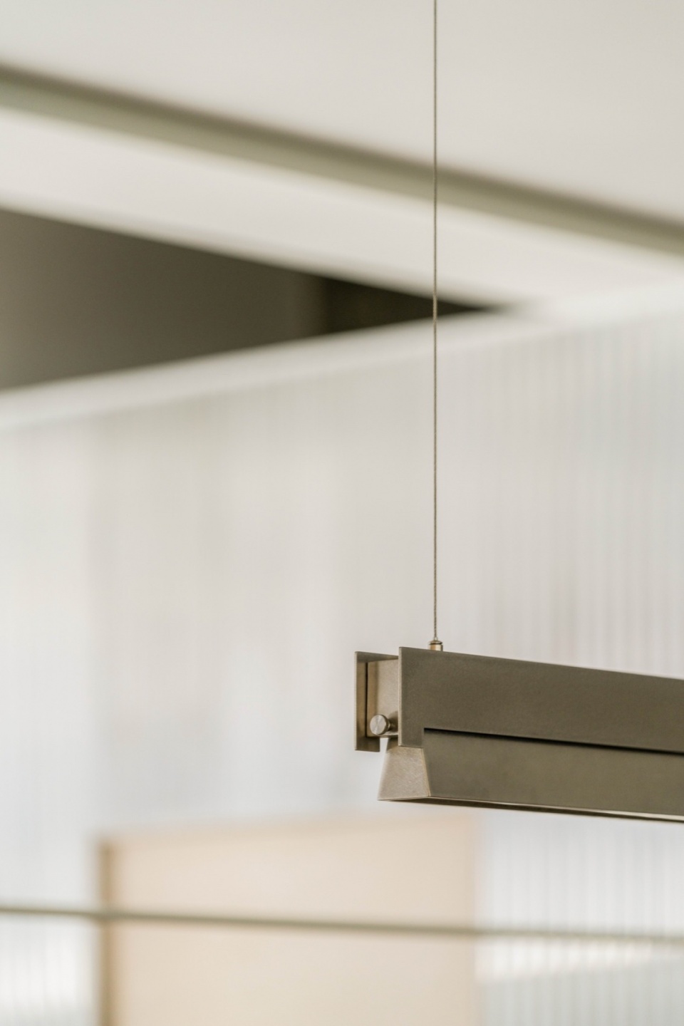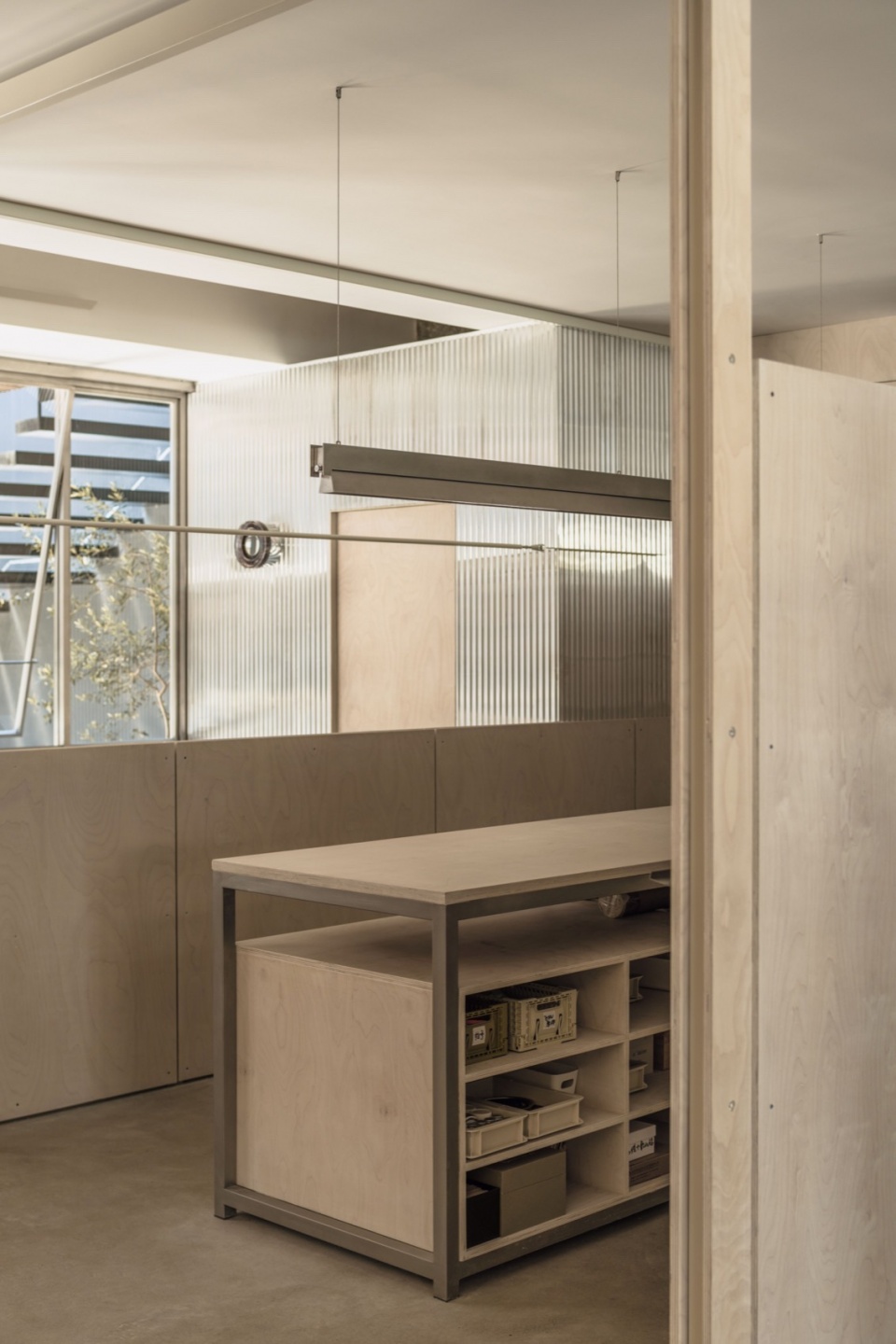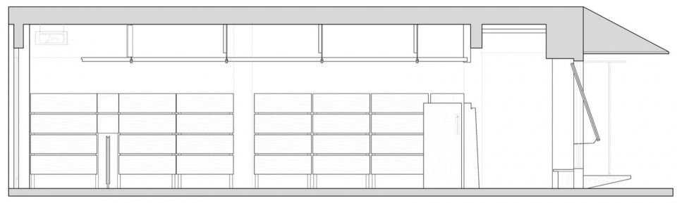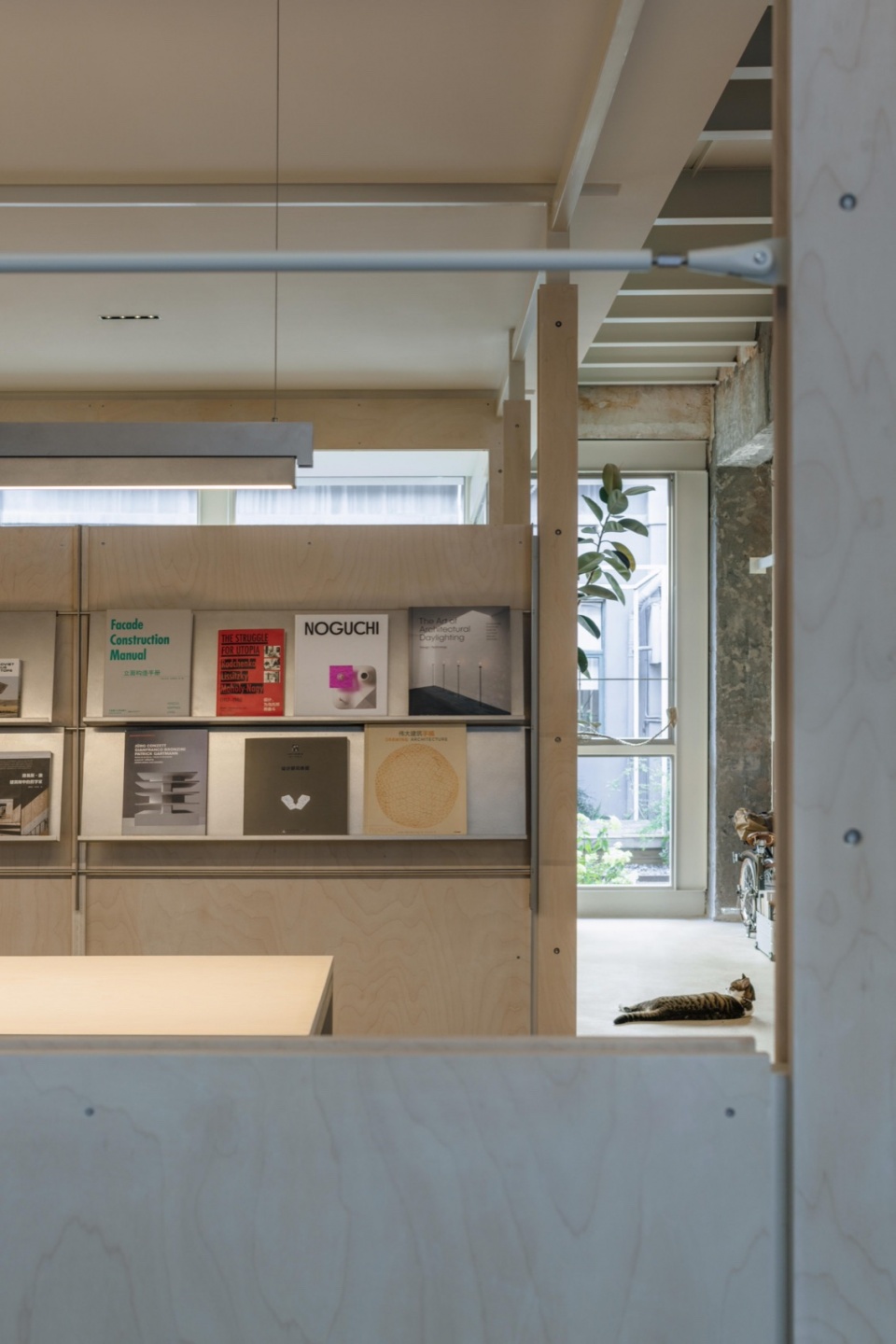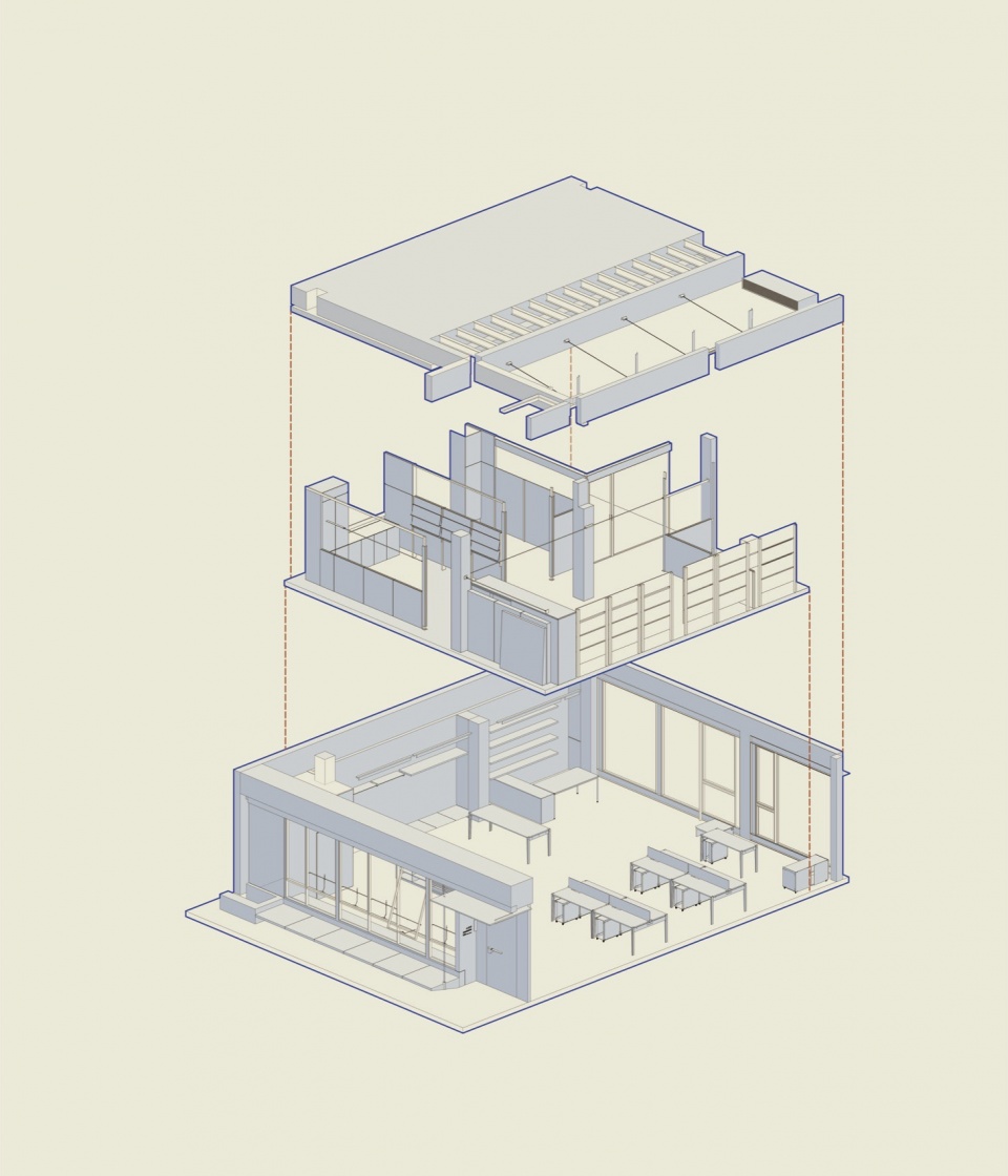 In interior design, we try to maximize functionality by dividing the space into different systems: top-hung windows, display, hanging, office furniture, and lighting. Modularization and systemization are employed throughout the project to create a flexible, adaptable space. Top-hung window: To balance aesthetics and practicality , we redesigned a top-hung window system with foldable handles for position limiting.