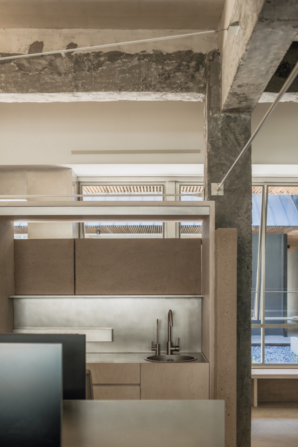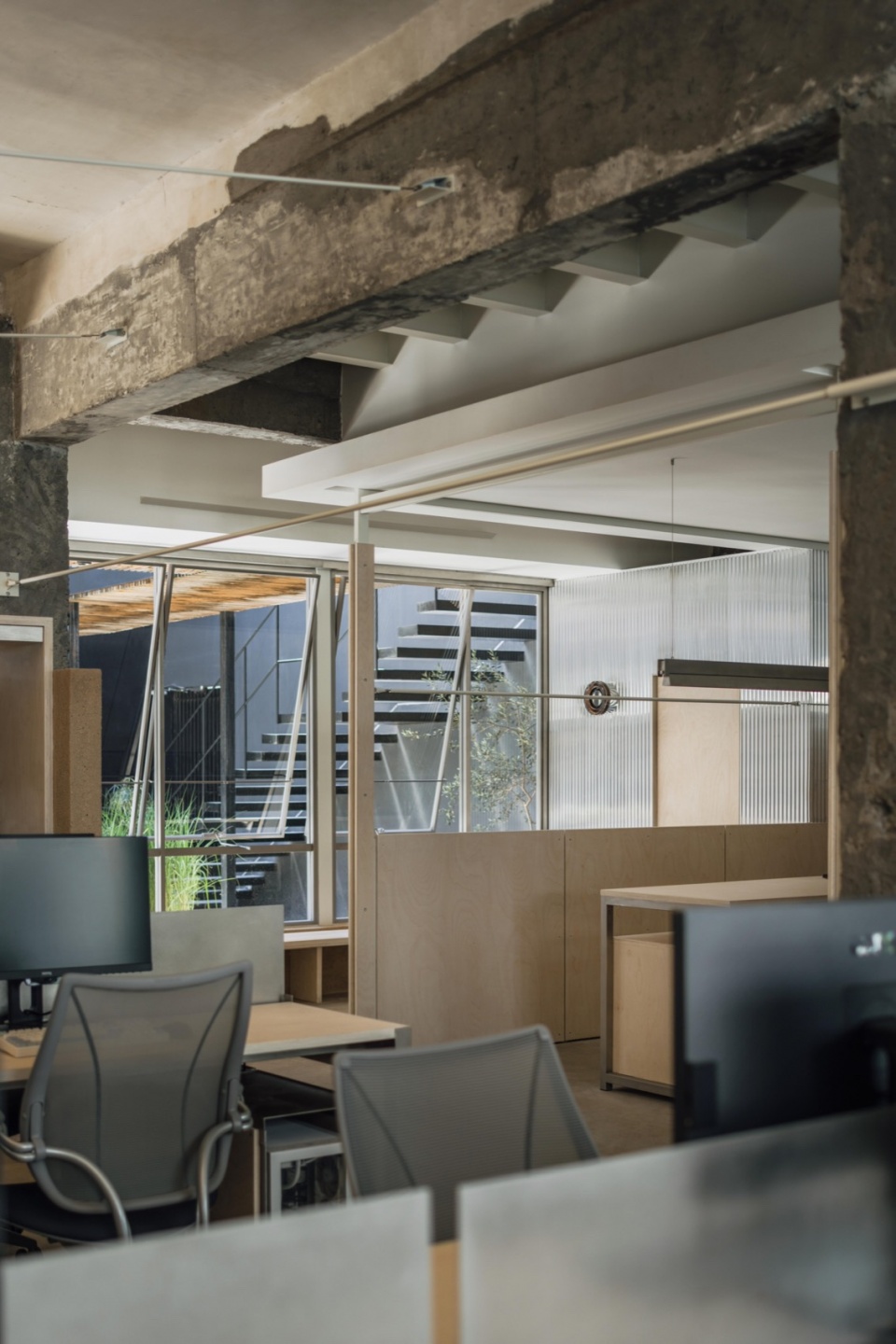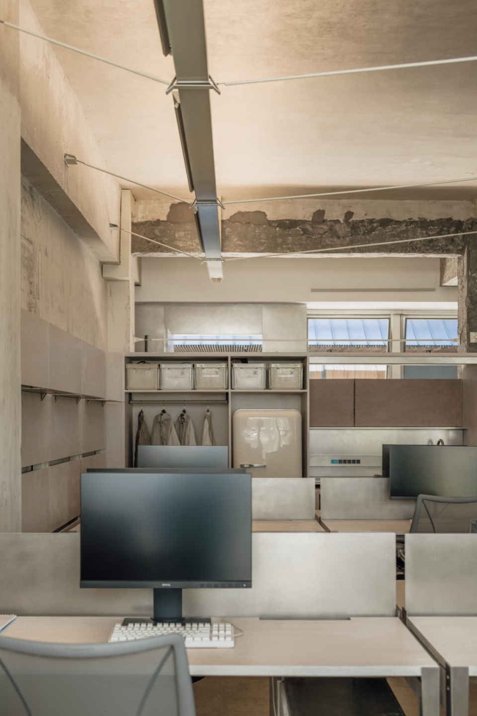 We preserved the raw texture of the original space and kept the new elements functional. The original walls, exposed beams, and columns are presented in a more visual form, establishing a dialogue between past and present.