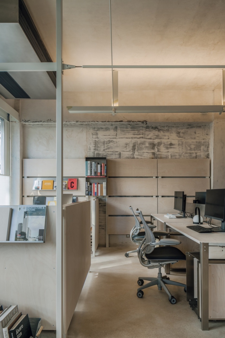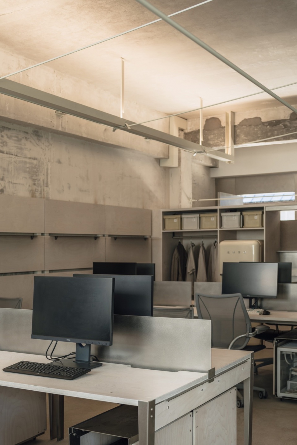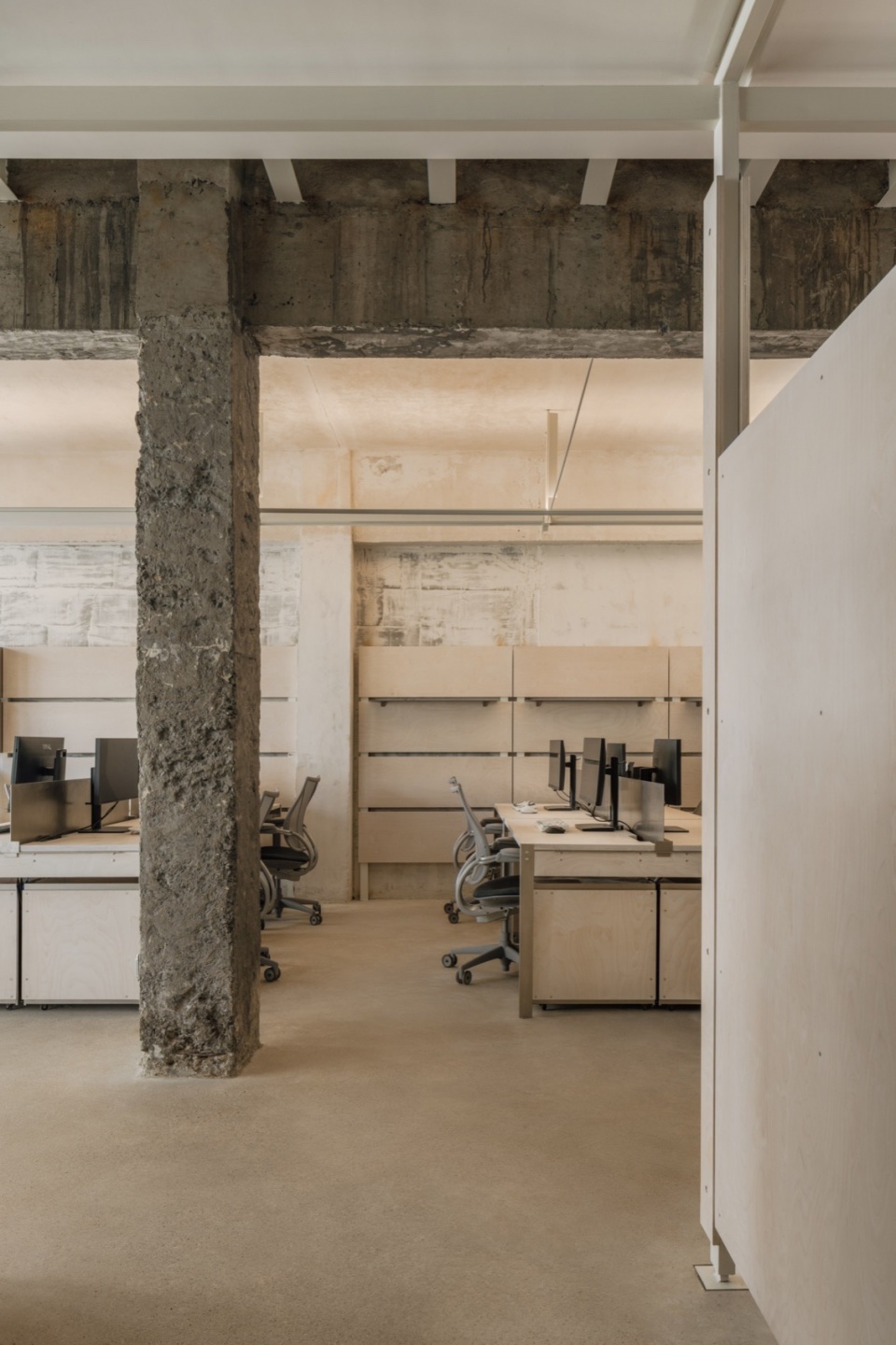 We preserved the raw texture of the original space and kept the new elements functional. The original walls, exposed beams, and columns are presented in a more visual form, establishing a dialogue between past and present.