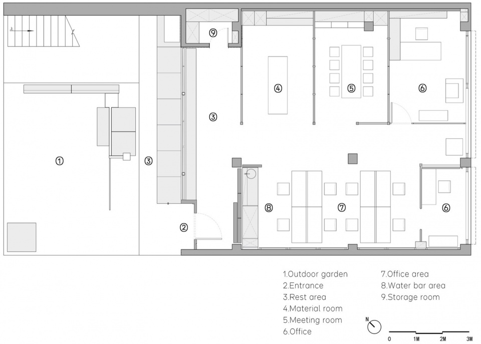办公室位于创意园区的一层,这意味着我们第一次同时拥有室内和室外的空间。因此,如何有效地将这些空间整合,成为整体布局中需要考虑的重要因素。从开窗面着手,设计将低矮的窗台与地台相结合,延伸至室外,在室外设置绿植与休闲区,营造轻松的办公环境,并实现室内外的通透。