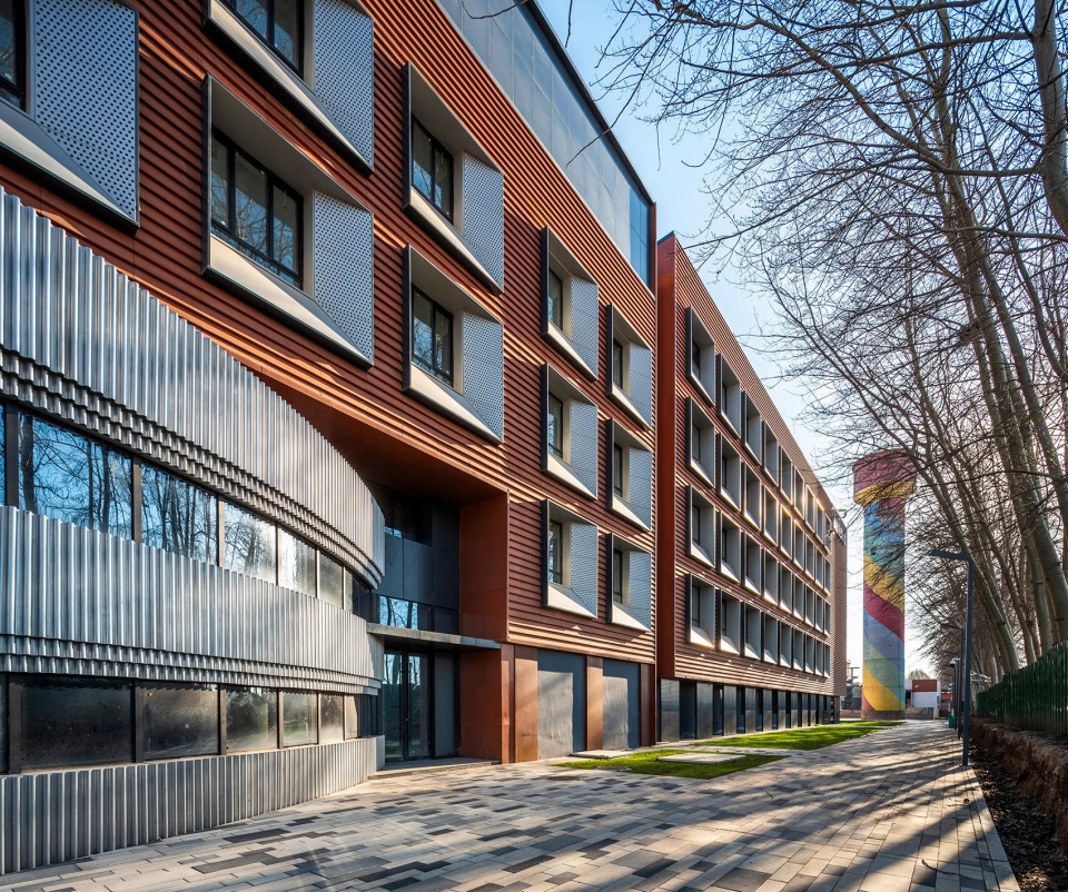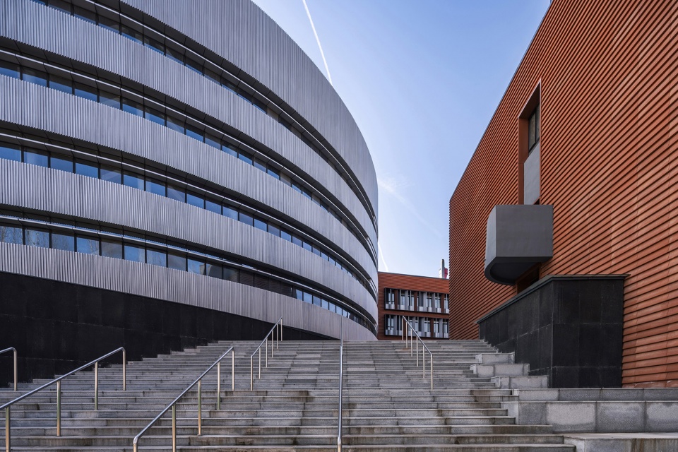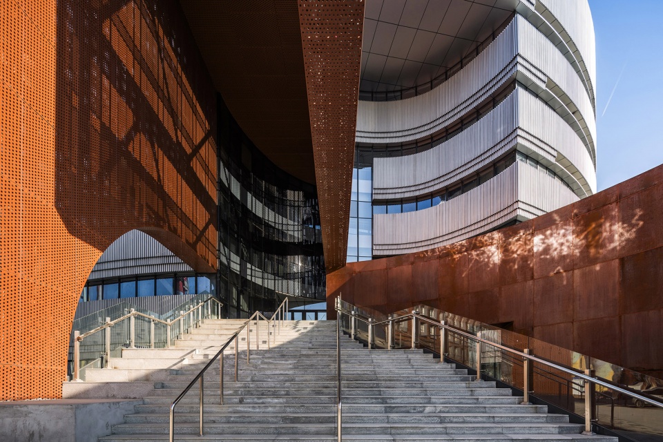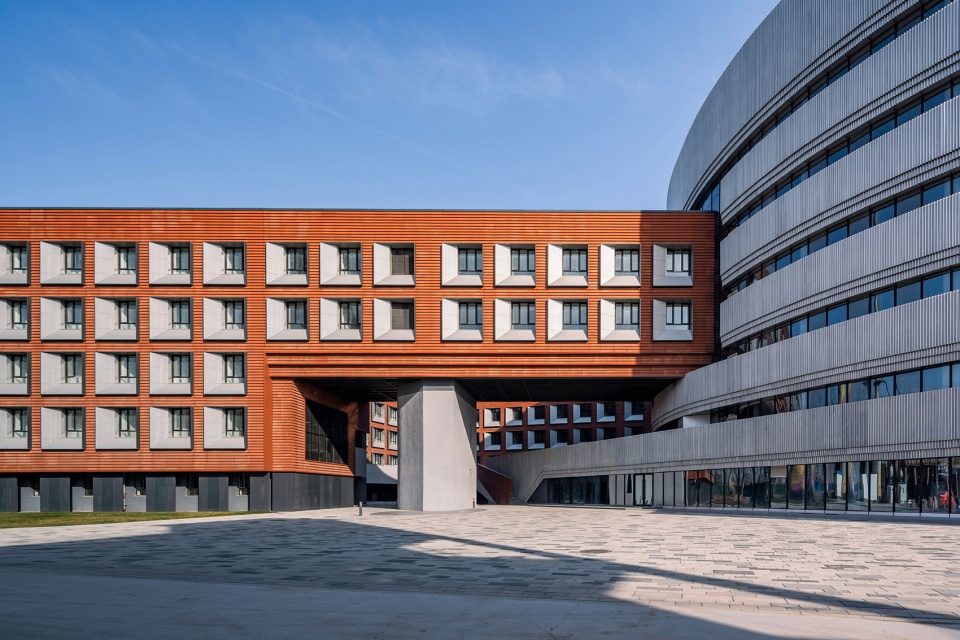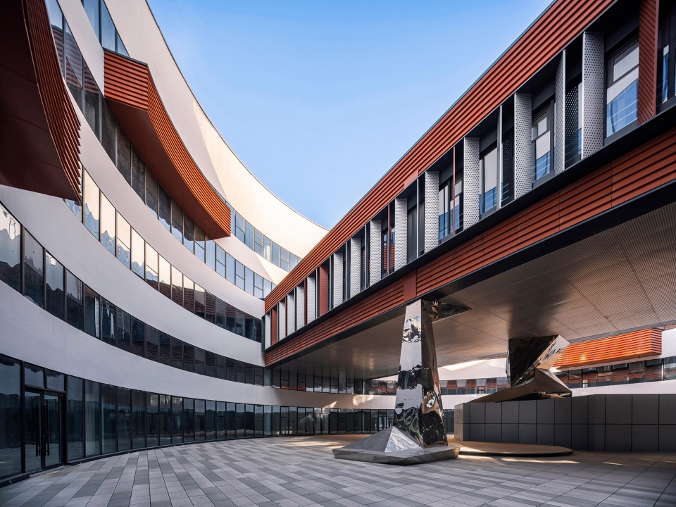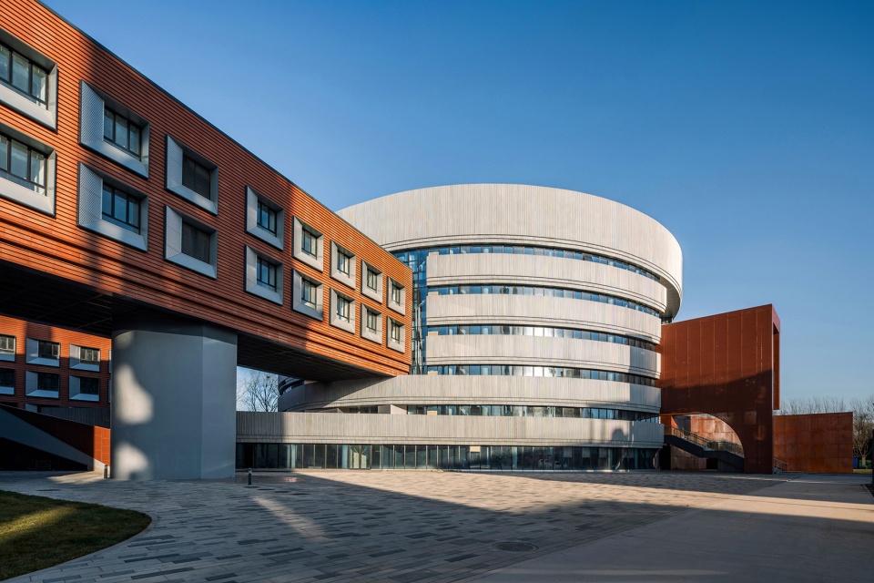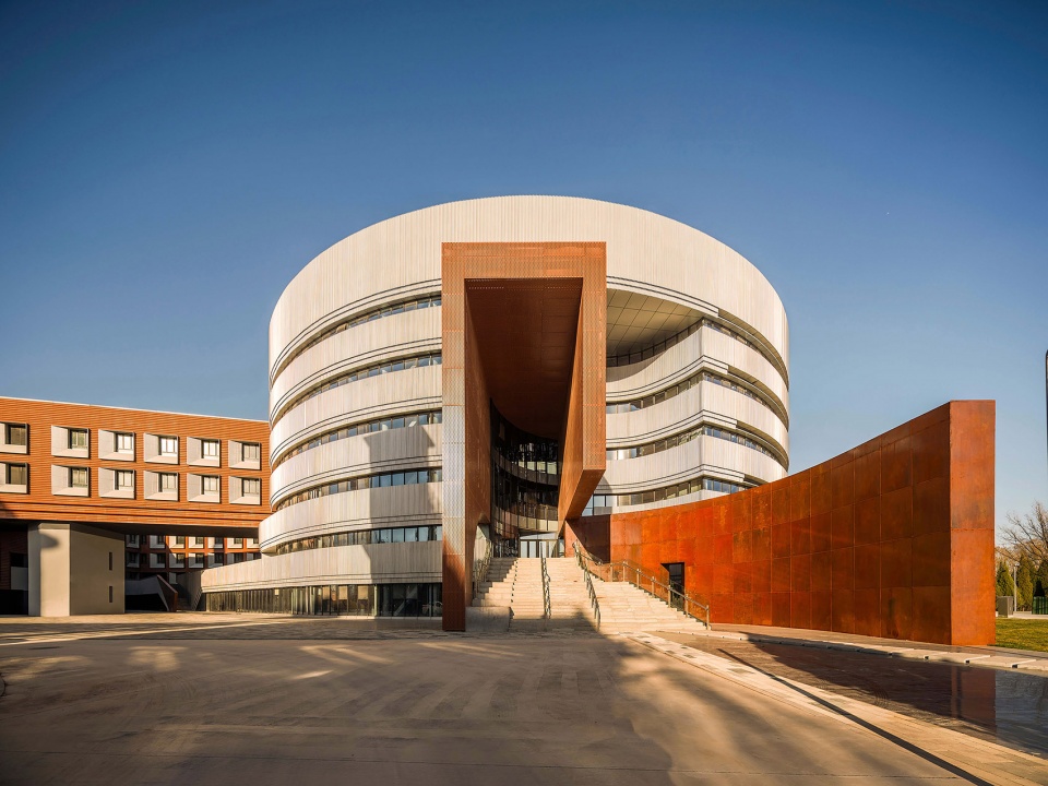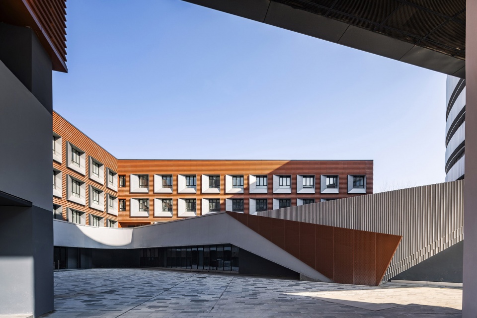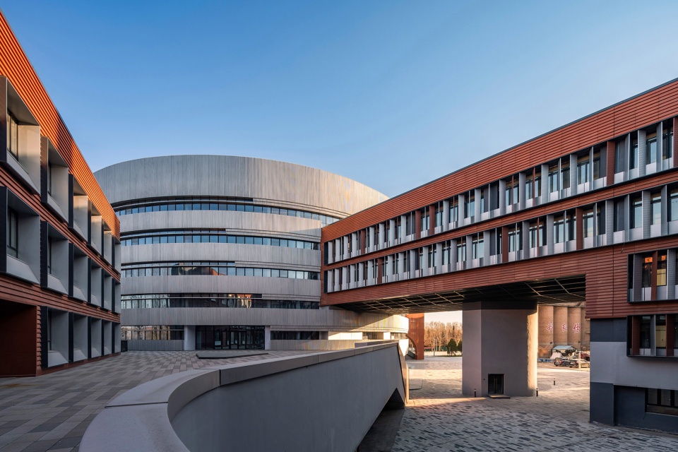 在设计中运用与工业遗址相似的工业材料,将传统的工业元素与现代建筑的设计手法相结合,在建筑材料、色彩和几何语言上呼应周边工业遗址建筑,形成园区的整体形象。基地东侧的圆柱形教学楼具有更强的外向性,成为主要的展示主体。圆柱形的主体外立面采用银色曲面金属板与隐框玻璃幕墙相结合,凸显一种现代感、流线型、光影效果和科技感,打造出既生动又简洁的视觉感受;教学楼的入口处采用砖红色陶板与砖红色穿孔金属铝板相结合,突出了入口区域的视觉效果,同时砖红色与工业遗址的传统红砖颜色呼应,也与现代建筑的流线形态产生强烈对比,形成丰富的文化层次感。