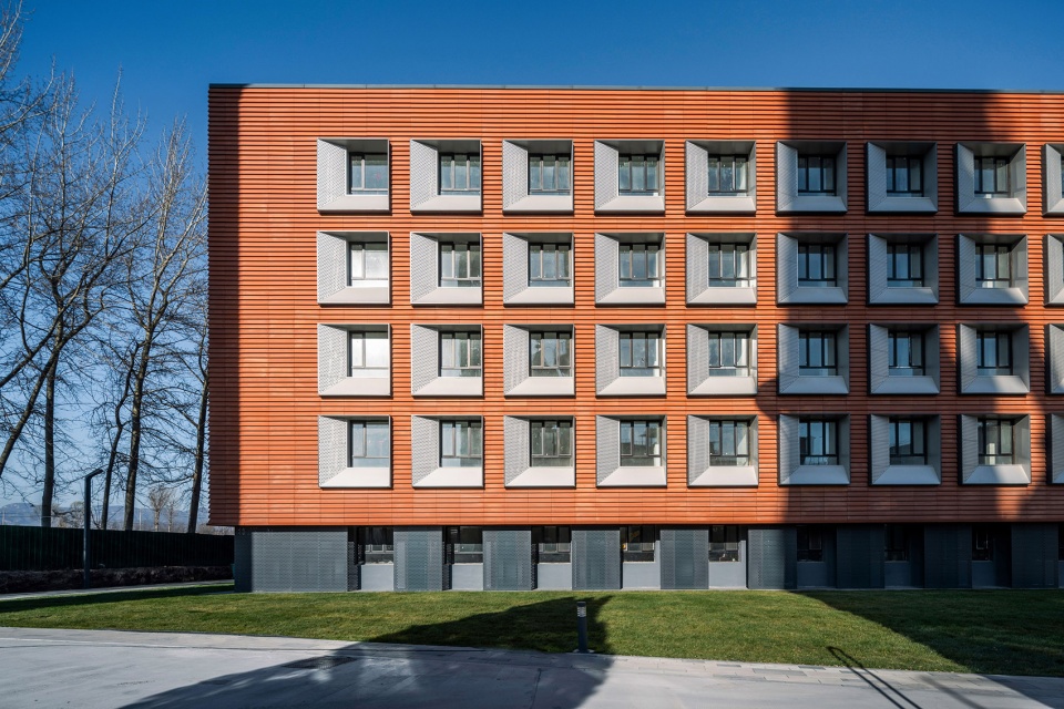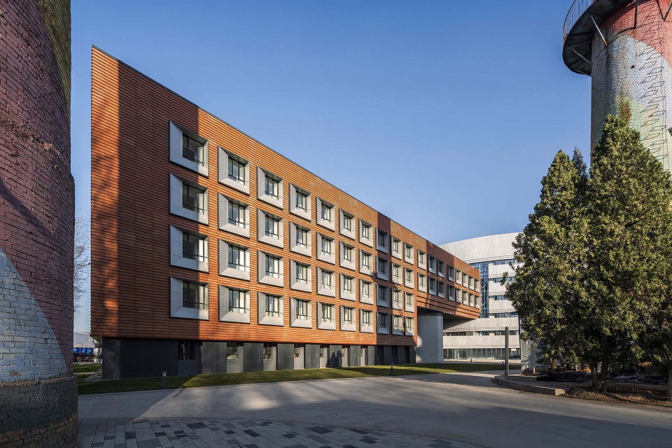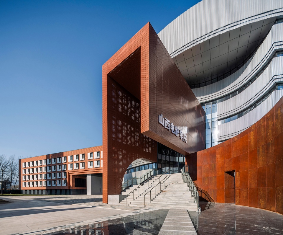 基地西侧宿舍楼外立面主体采用砖红色金属板结合银色穿孔铝板的窗洞,与教学楼形成对比协调关系。宿舍楼从功能上更加的沉稳,因此采用温暖亲切的砖红色为主色调,也与南侧工业遗址改造的贾樟柯艺术中心相呼应;银色的穿孔铝板窗洞,增添了立面的现代质感,与环境光产生丰富的反射效果。总体上形成一种简洁、精致且具有艺术感的外立面效果。
