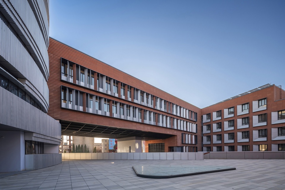 The dormitory building on the west side uses brick-red metal panels and silver perforated aluminum panels for the windows, forming a balanced contrast with the teaching building. The dormitory building is more stable in function, using warm, welcoming brick-red tones, which also echo the nearby Jia Zhangke Art Center, a renovated industrial site.