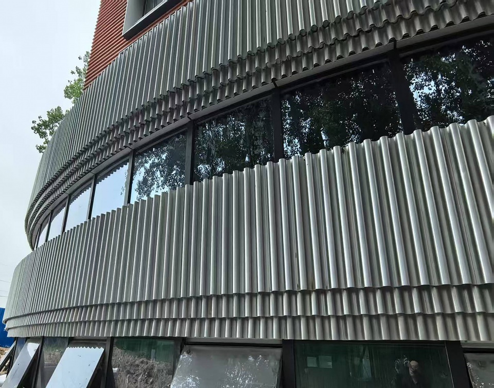 ▼银色金属波纹板与隐框玻璃幕墙,silver perforated aluminum panels and hidden frame glass curtain wall