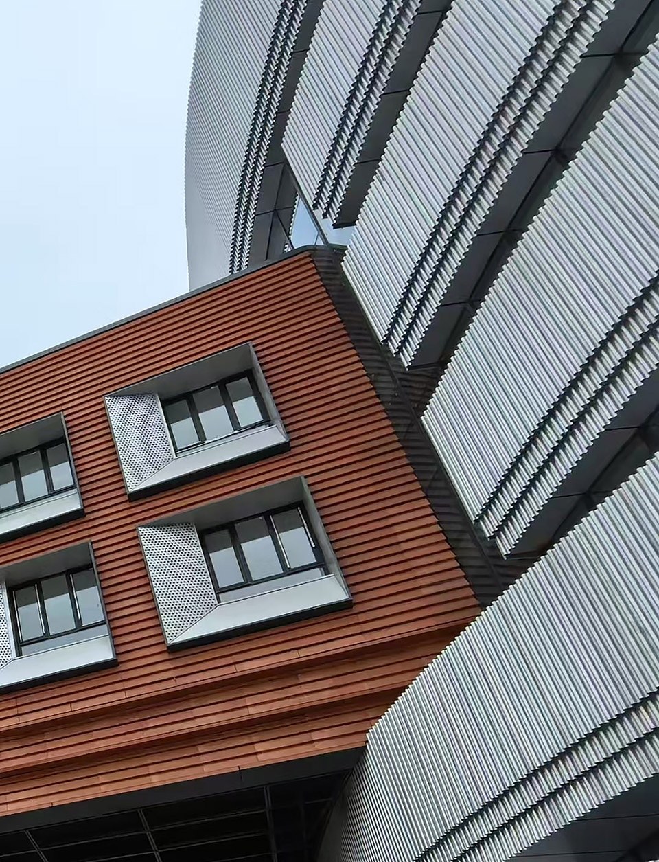 ▼砖红色陶板与银色金属波纹板,silver perforated aluminum panels and brick red ceramic plate