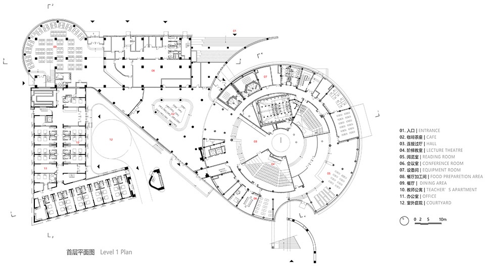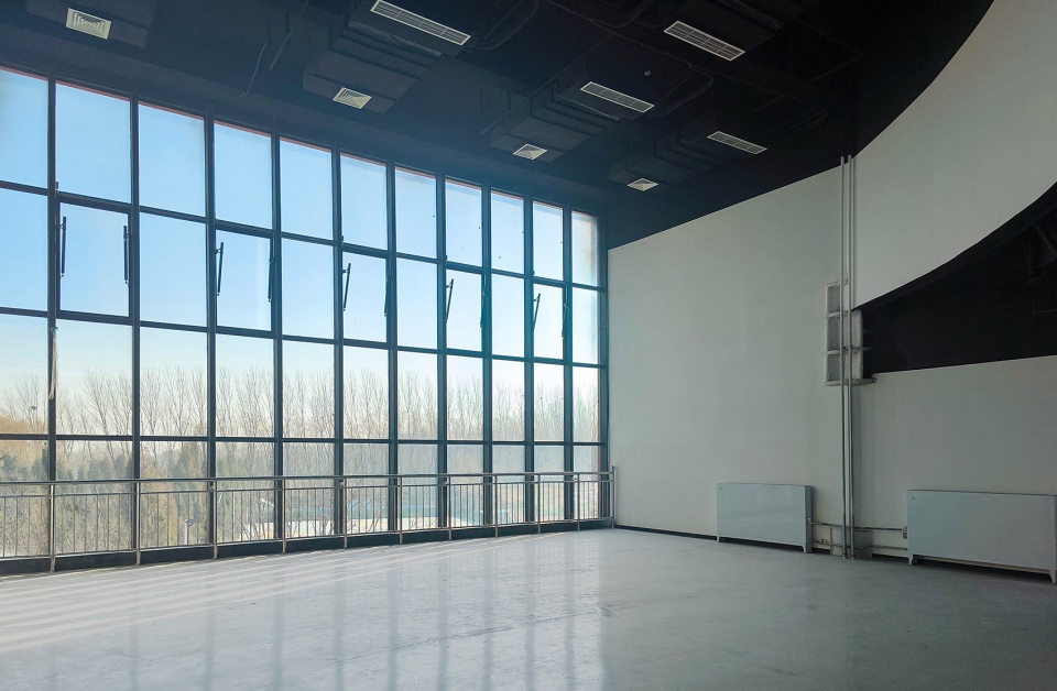 The circular teaching building courtyard is located on the second floor. The north side faces the road, with dual entrances on the first and second floors. The first floor includes spaces for lecture halls, reading rooms, sound mixing studios, offices, conference rooms, and equipment rooms. An outdoor staircase leads to the second-floor rooftop platform, providing access to the second-floor entrance, which leads to the circular inner courtyard. On the south side, the teaching building faces the art center and has large steps leading directly into the courtyard.