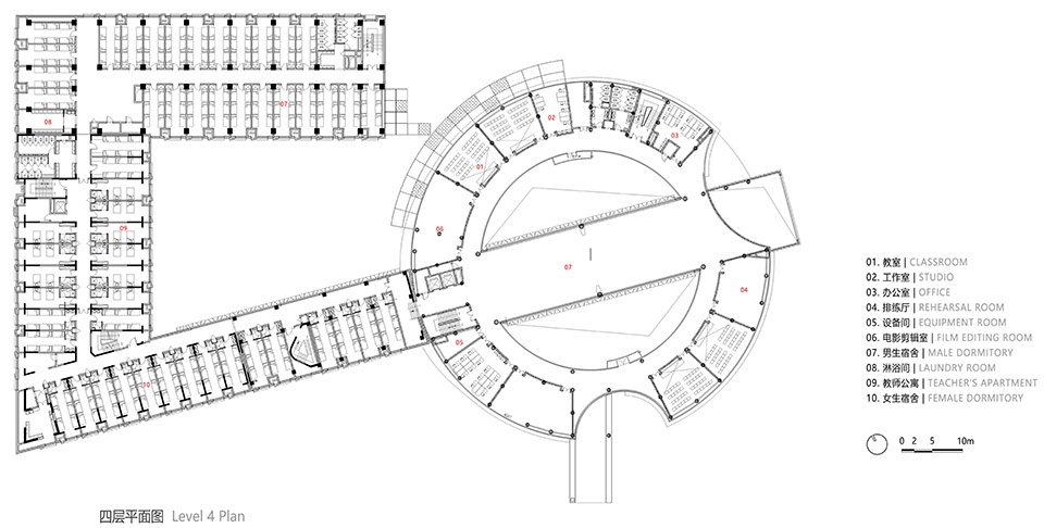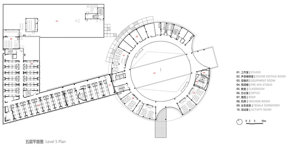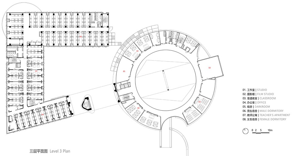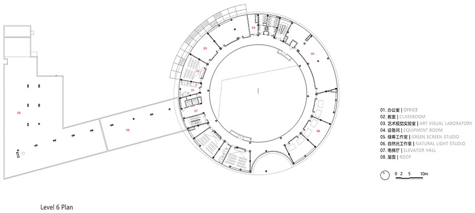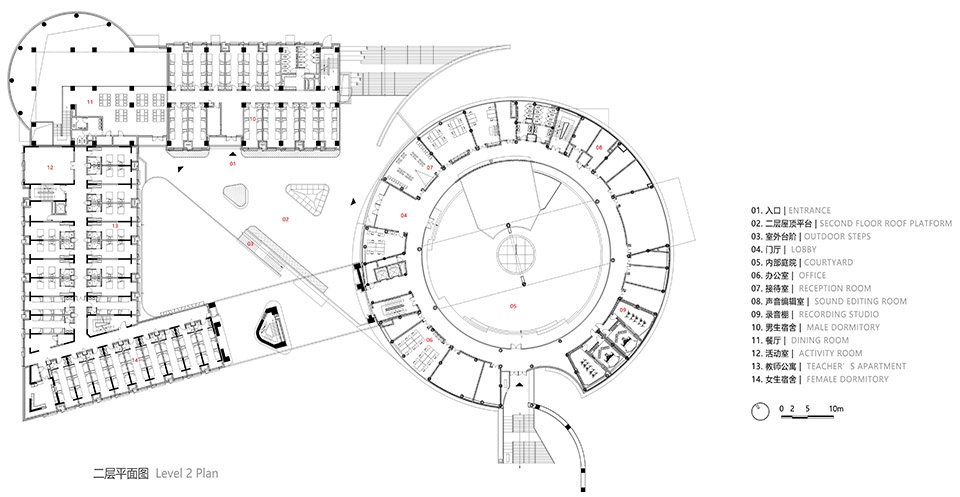 圆柱形的教学楼院落位于教学楼二层。北侧面向道路设置教学楼的双首层入口,一层入口通过地面层直接进入教学楼的首层,首层空间布置阶梯教室、阅览室、混音棚、办公室、会议室和设备用房等功能空间;通过室外大台阶到达二层屋顶平台,设置进入教学楼的二层入口,通过门厅直通圆柱形教学楼的内部圆形庭院空间,同时教学楼南侧面向艺术中心也设置大台阶,直接进入教学楼二层内部庭院。