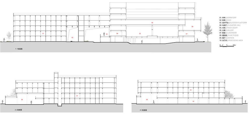 矩形的宿舍区院落分为两个不同高差的三角形院落空间。从北侧主入口大台阶进入三角形二层空中院落,院落中设置进入教学楼、男生宿舍、食堂的二层入口;从南侧面向艺术中心的广场进入位于地面层的三角形宿舍院落空间,院落中设置教职工宿舍、女生宿舍的入口和通向二层院落的台阶。