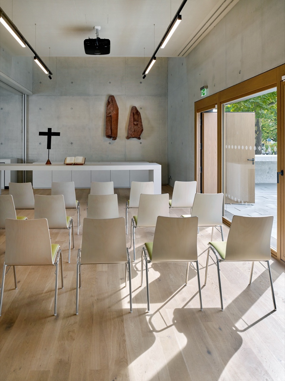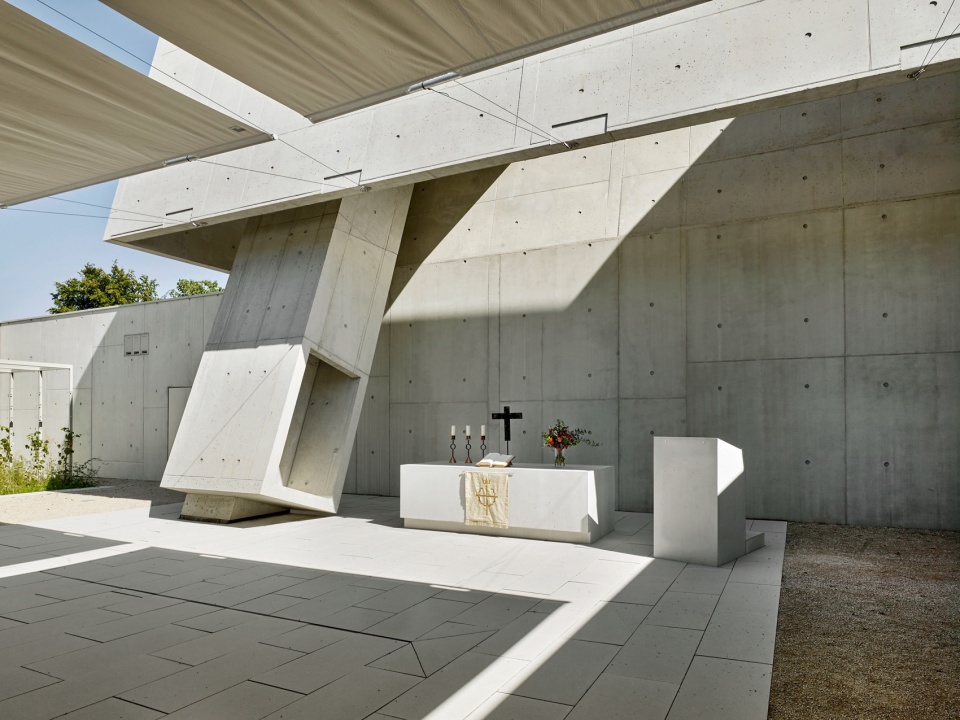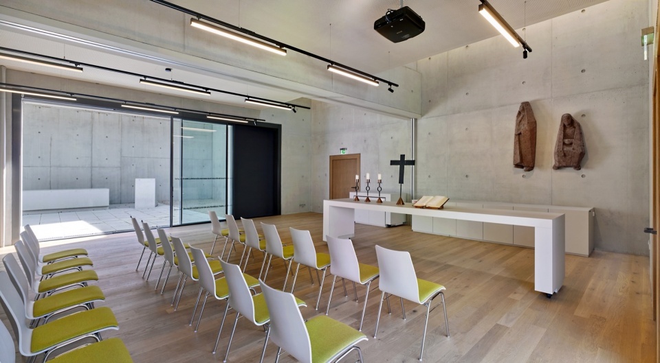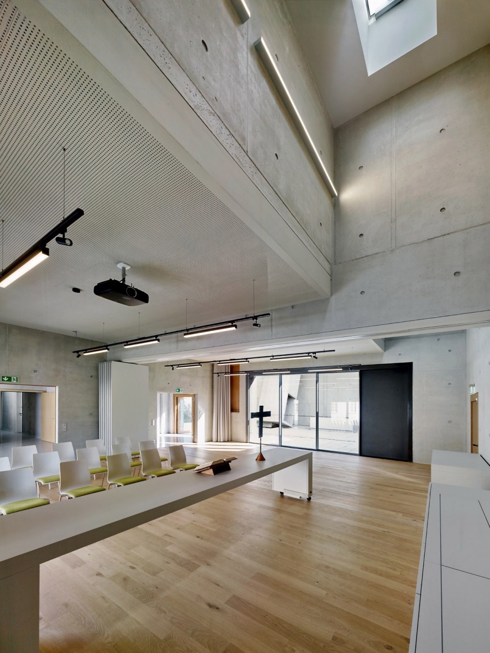 To the east, the new outer church provides an additional outdoor space that unlike the church square is sheltered and introspective, whereby there is an unimpeded view upwards exclusively of trees and the sky. Like a traditional church spire, a skylight acts as an urban highlight. The skylight creates atmospheric lighting inside the outer church, lending church services and other events a spiritual touch. Under the skylight the altar, the ambo and the “stairway to heaven” echoes the structure of the outer church on the scale of furniture. Since both use fair-face concrete, the fit-out and the building meld. The white cross on the outside wall catches the eye thanks to its special color and materials.