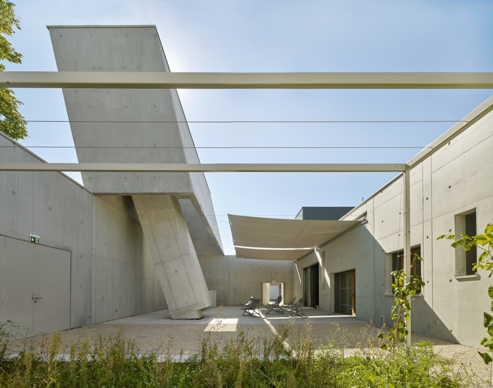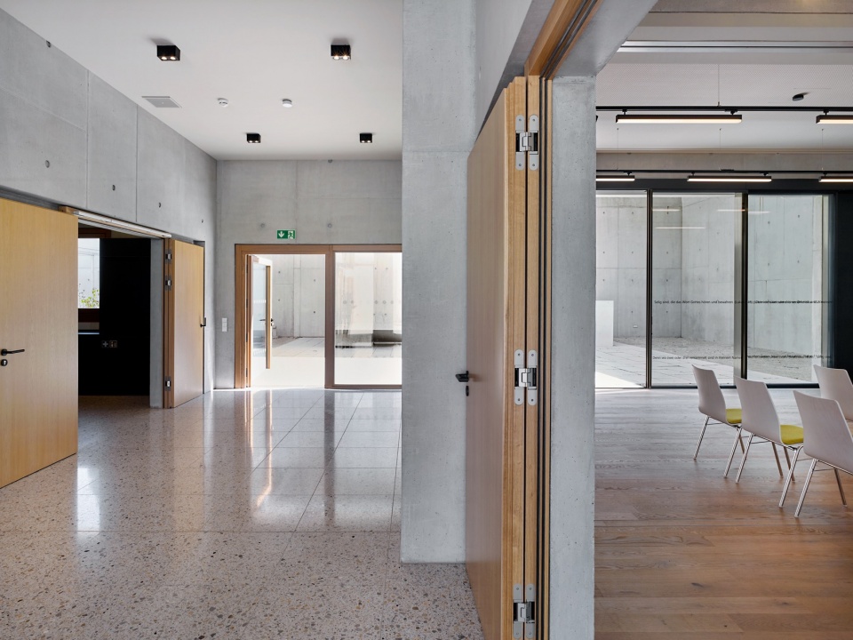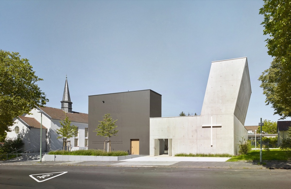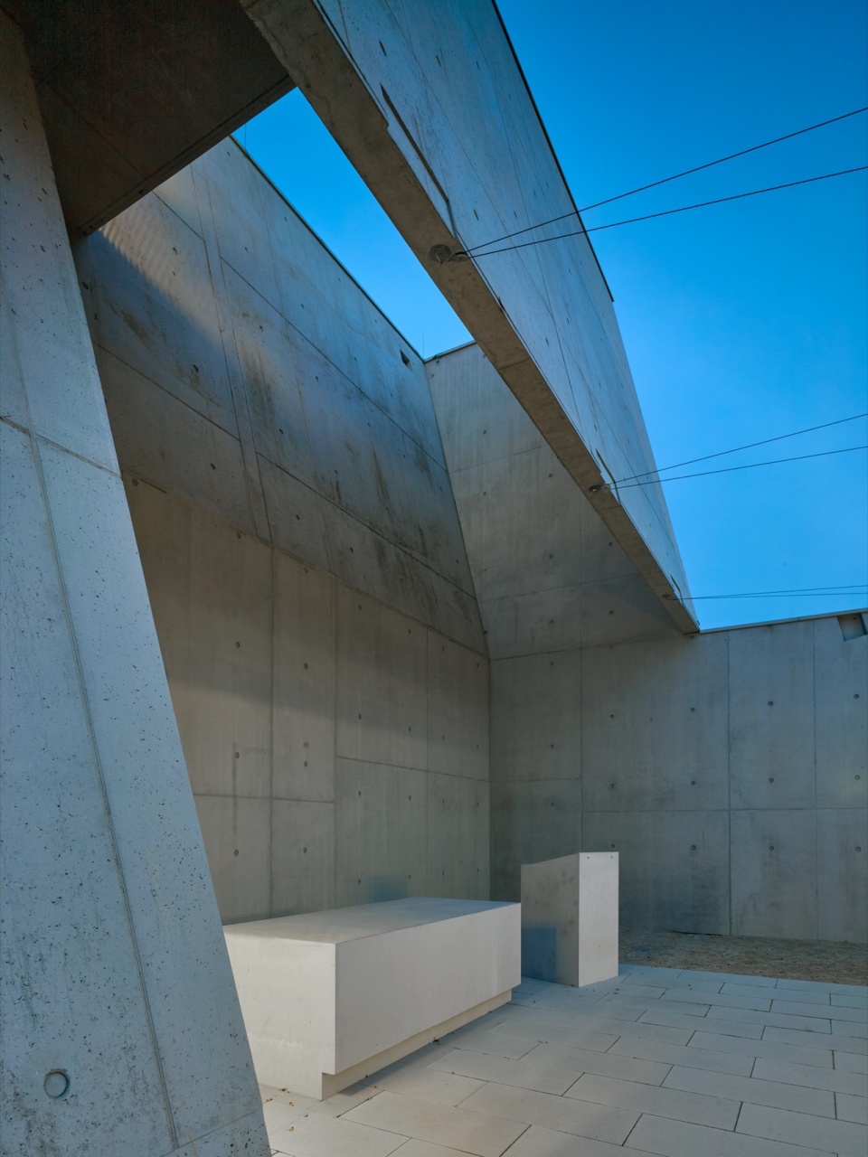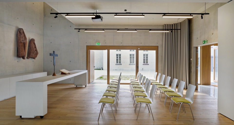 To the east, the new outer church provides an additional outdoor space that unlike the church square is sheltered and introspective, whereby there is an unimpeded view upwards exclusively of trees and the sky. Like a traditional church spire, a skylight acts as an urban highlight. The skylight creates atmospheric lighting inside the outer church, lending church services and other events a spiritual touch. Under the skylight the altar, the ambo and the “stairway to heaven” echoes the structure of the outer church on the scale of furniture. Since both use fair-face concrete, the fit-out and the building meld. The white cross on the outside wall catches the eye thanks to its special color and materials.