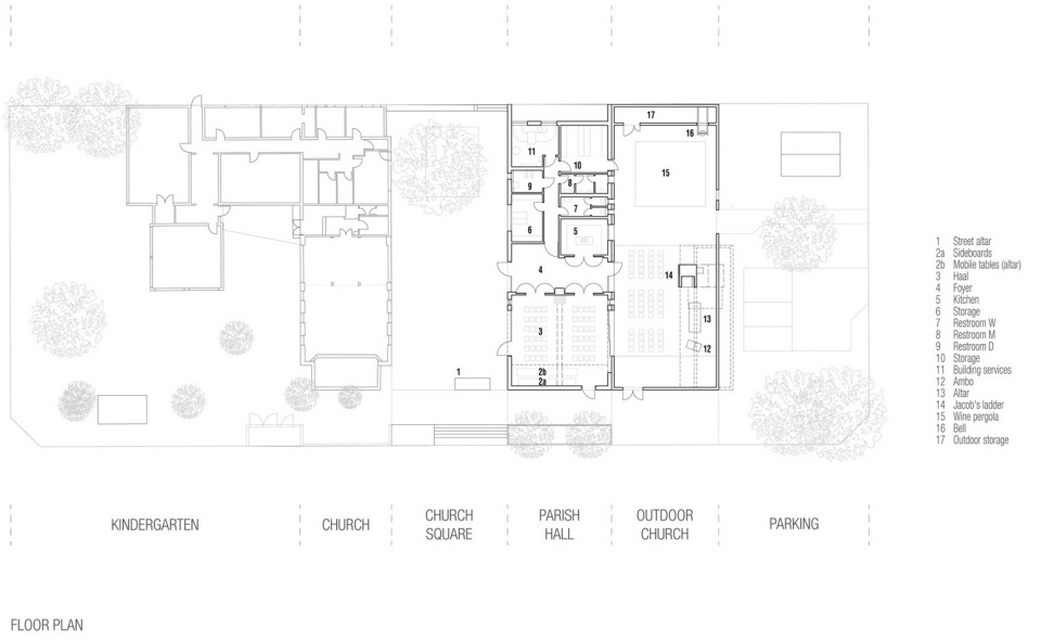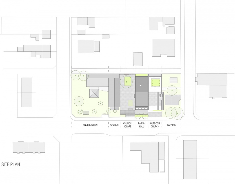 扩建项目被划分为三个连续的区域:教堂广场、教区大厅和户外教堂,向东延续了场地西侧“幼儿园—教堂”的现有序列。在西侧,新的教堂广场将教区大厅与现有教堂连接起来,形成一个对公众开放的广场。该广场不仅便于教堂和教区大厅访客的流动,也为社会活动和节庆聚会提供了空间。朝向南侧Brunnenweg街道的一侧设有“街道祭坛”,面向城市环境展开,强调该建筑群的宗教功能。