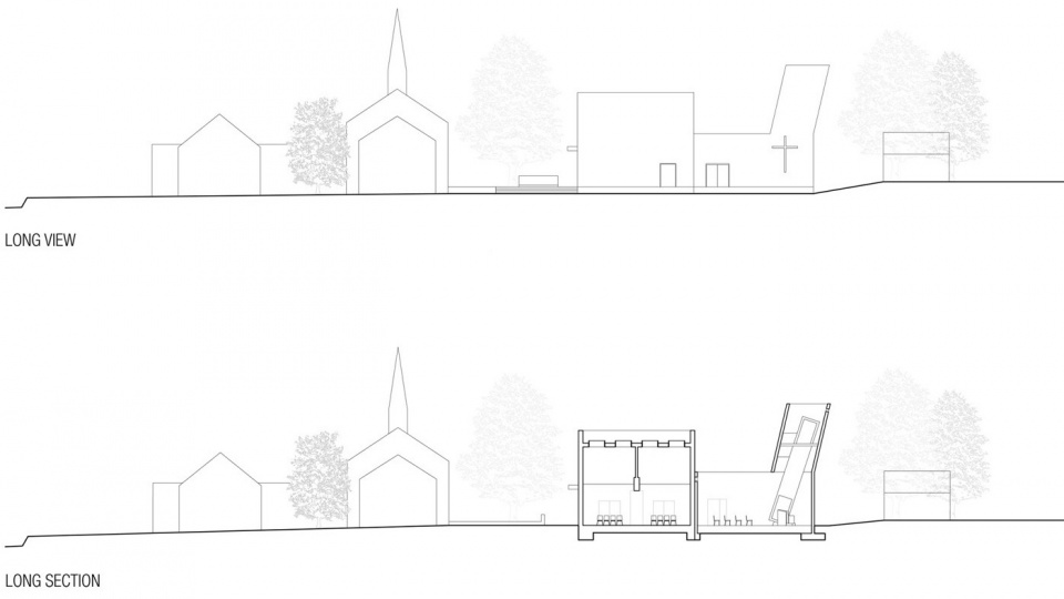教区大厅的平面为简洁的长方形,但通过纵向布置在城市结构中形成独特存在感。大厅南侧设有一条贯穿整个建筑宽度的天窗,为空间带来自然光线。这里是教堂大厅——教区活动和礼拜仪式的举行地。建筑后部以斜坡形式降低高度,与侧向使用的附属空间形成连贯布局。大厅内两扇落地大窗相对而设,将教堂广场、教区大厅与户外教堂串联成一个视觉轴线,使访客得以亲身体验“空间序列”的设计理念。