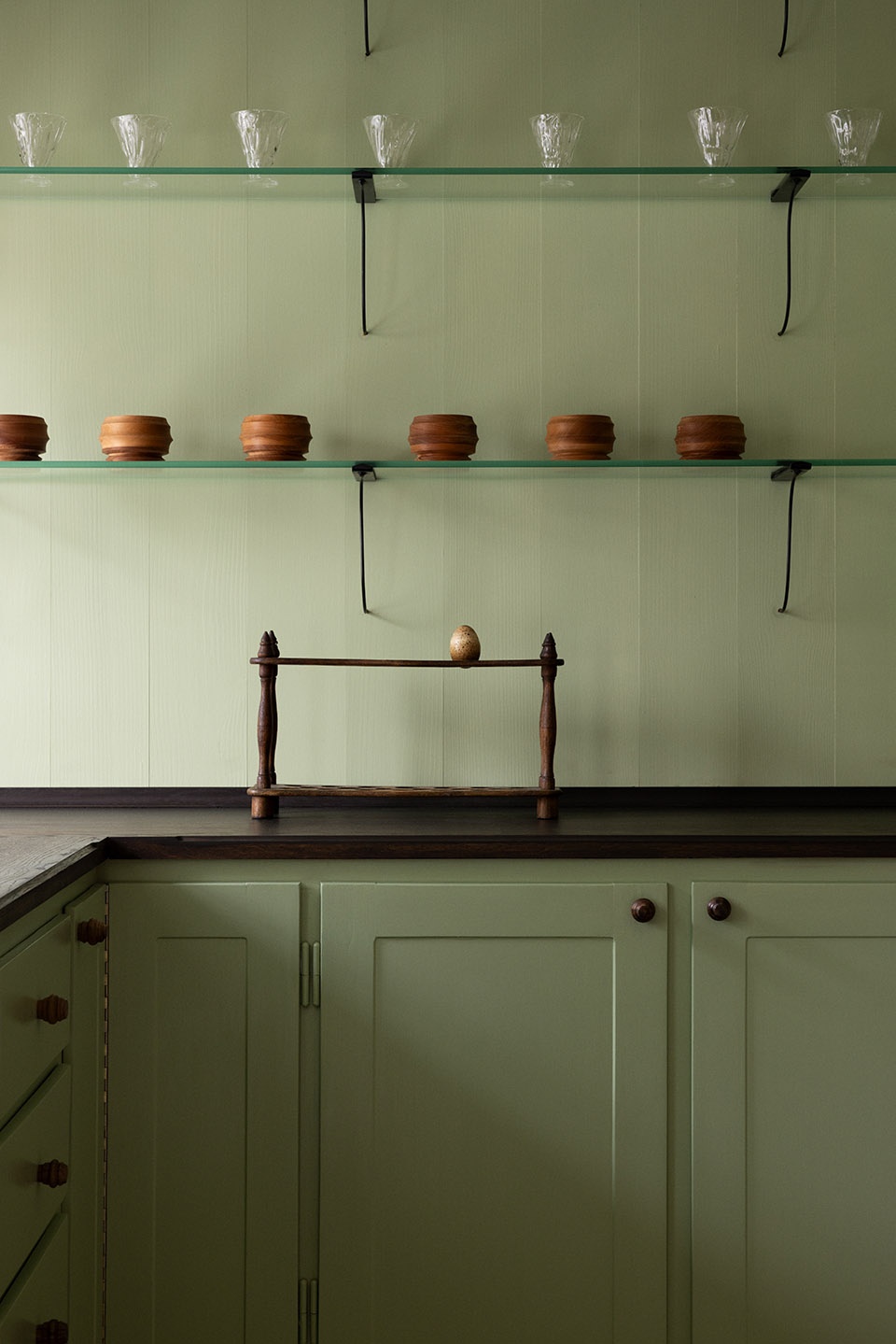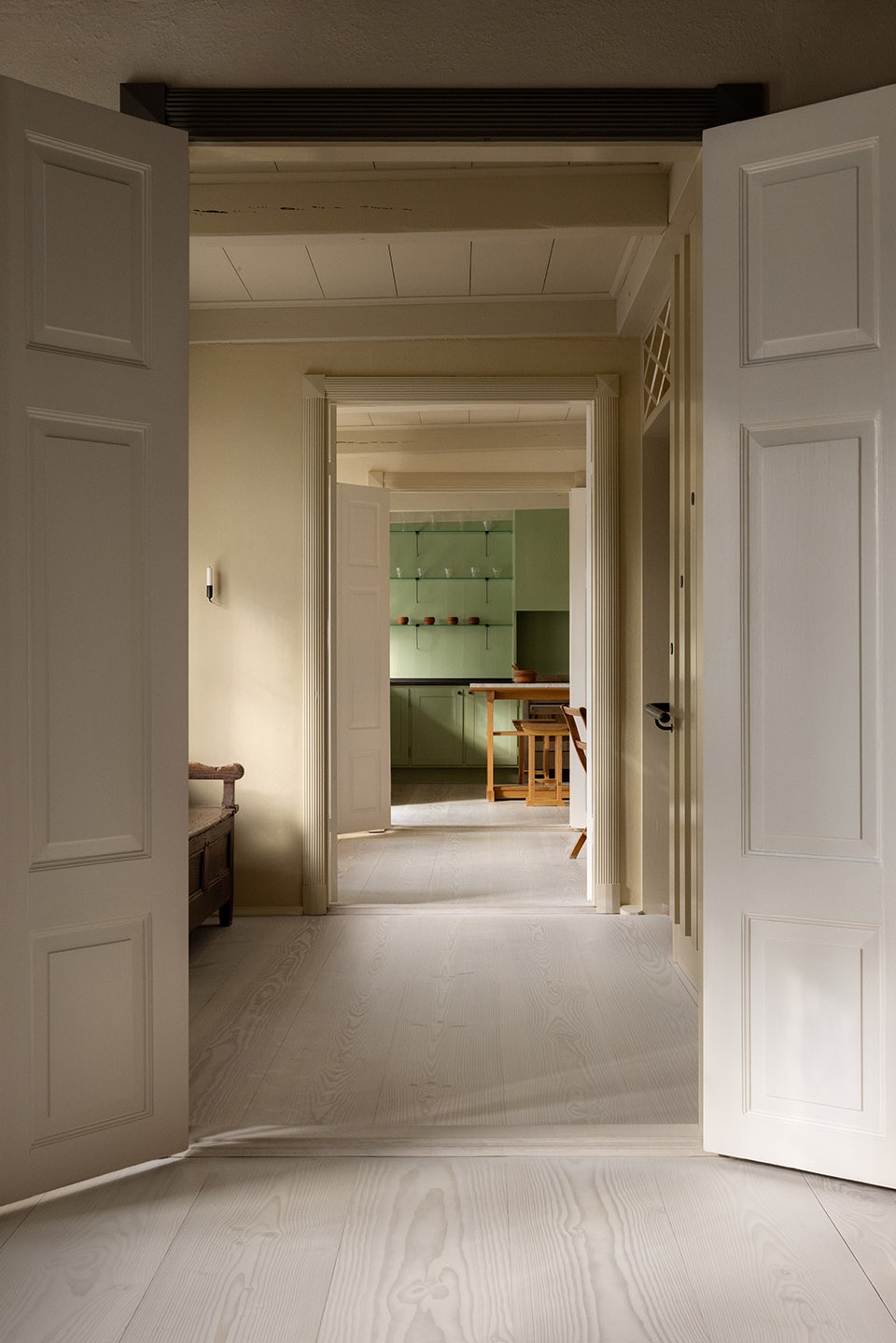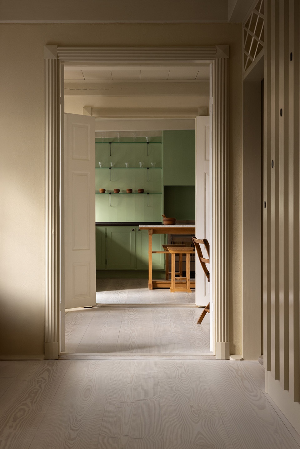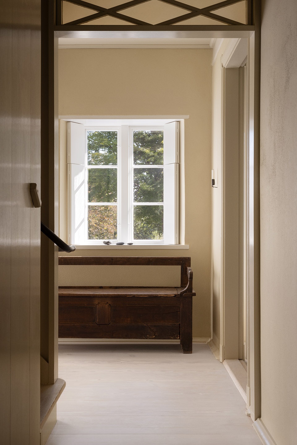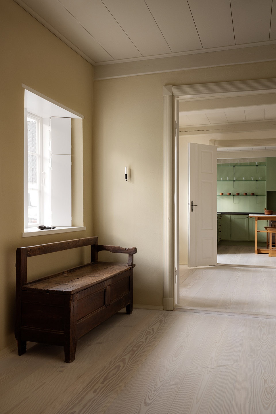 While the original framework carried out by Overby was still sound, Mentze Ottenstein reviewed all surfaces and material compositions, introducing a fresh take on colour and working thoroughly with detailing to create a more harmonious experience. The handcrafted kitchen cabinets have been painted an eye-catching shade of green as a nod to its countryside location. Elsewhere, a series of hand-turned ceramic bowls from Georgia sit comfortably alongside new walnut and pear kitchen handles. Further colour can be seen in the aisles and small chambers on the first floor, painted in golden ochre, creating a warm and intimate experience.