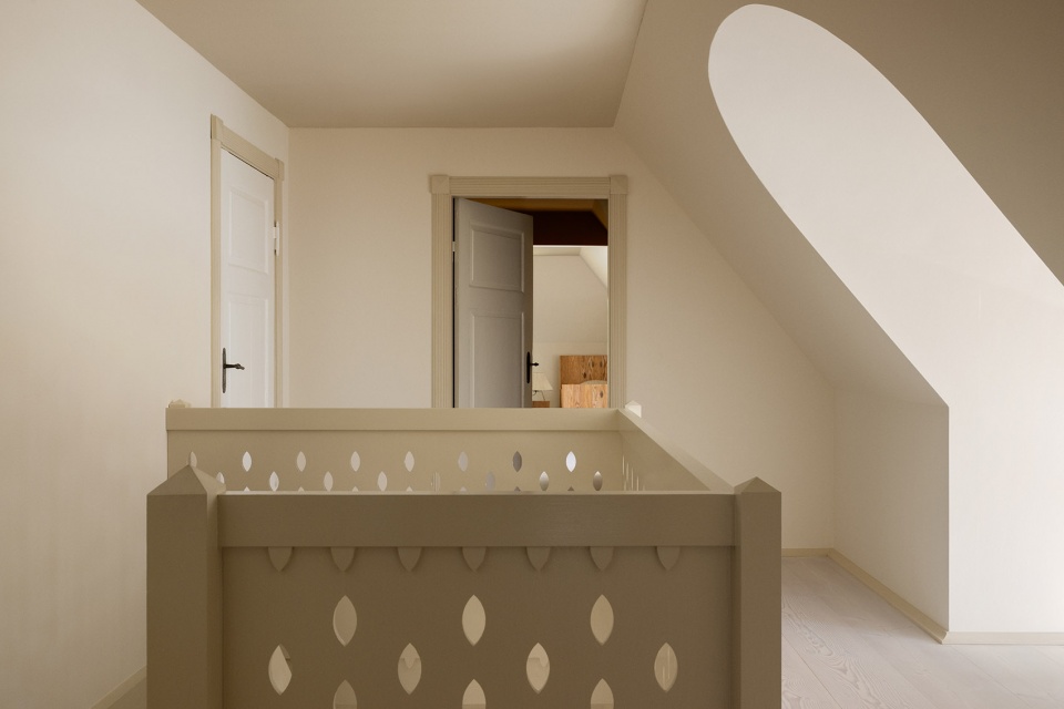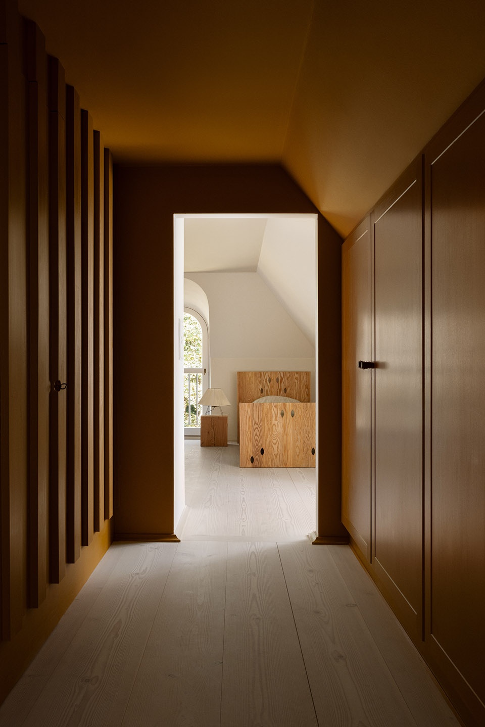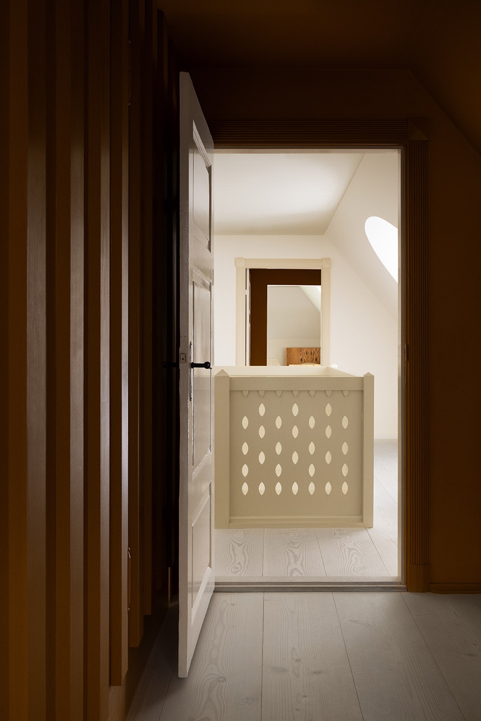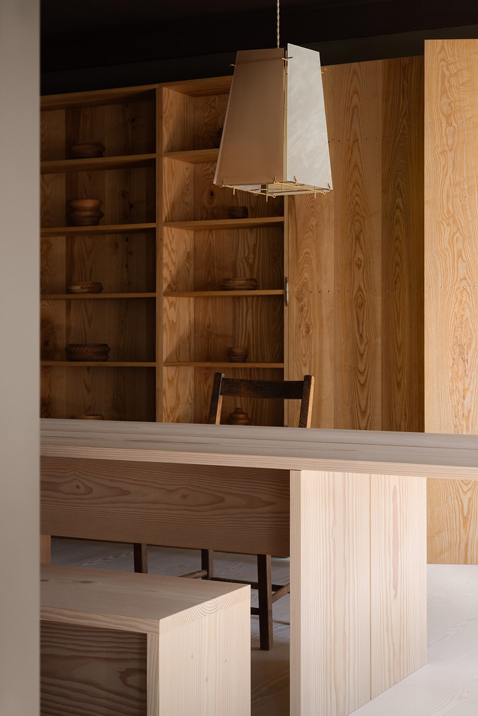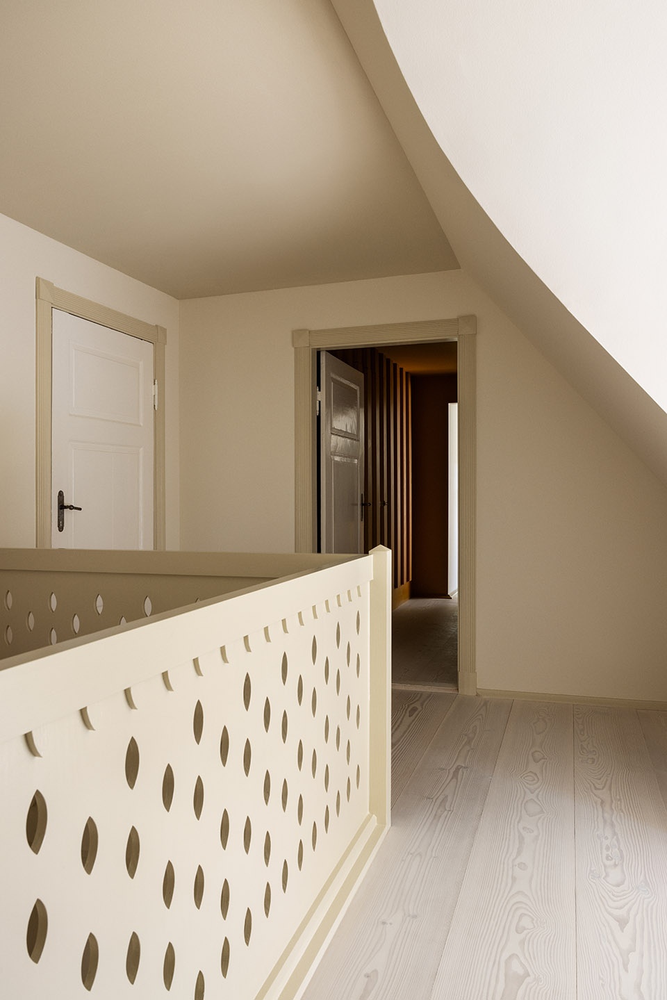 While the original framework carried out by Overby was still sound, Mentze Ottenstein reviewed all surfaces and material compositions, introducing a fresh take on colour and working thoroughly with detailing to create a more harmonious experience. The handcrafted kitchen cabinets have been painted an eye-catching shade of green as a nod to its countryside location. Elsewhere, a series of hand-turned ceramic bowls from Georgia sit comfortably alongside new walnut and pear kitchen handles. Further colour can be seen in the aisles and small chambers on the first floor, painted in golden ochre, creating a warm and intimate experience.